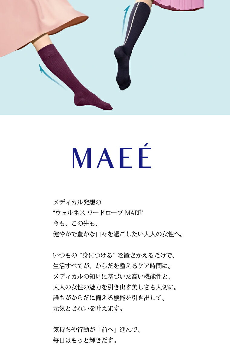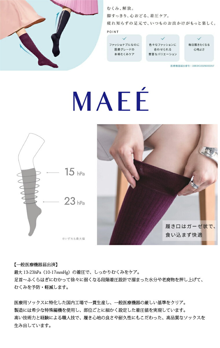 メーカー希望小売価格はメーカーカタログに基づいて掲載していますMAEÉ 【マエエ】 maee003 / 着圧ソックス MAEÉ 【マエエ】 コンプレッションソックス(コットンシアータイプ) MAEÉは2020年、「リンパ浮腫」と生きる方のために誕生しました。 リンパ浮腫とは、がん治療の影響や先天性などで、腕や脚が慢性的にむくんでしまう状態のこと。 一度発症すると完治は難しく、生涯つきあう慢性疾患と言われています。 女性にとって、リンパ浮腫ではなくても、むくみは身近。 けれど「仕方のないもの」としてあきらめがちな症状です。 おしゃれしながら本格むくみケアできる、一般医療機器届出済の着圧ソックス。 ファッション性の高い上質なソックスでありながら、足首~ふくらはぎにむかって緻密に設計された段階着圧が特長です。 日中の活動する時間に履くだけの「ながらケア」で、血行やリンパのながれを促進し、つらい脚のむくみを予防・軽減します。 気持ちや行動が「前へ」-MAEÉ-進むきっかけになれば幸いです。 日本製。 brand MAEÉ (マエエ) country 日本製 fabric 綿 ナイロン ポリウレタン size size 23cm〜25cm info
