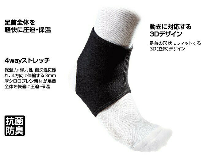 【仕様】 ・サイズ測定位置:普段お使いのシューズの大きさ ・左右:左右兼用 ・サポート力:ソフトサポート(レベル1) 【特徴】 ・保温力・弾力性・耐久性に優れ、4方向に伸縮するクロロプレンゴム素材が足首全体を快適に圧迫・保温 ・足にフィットし、動きを妨げないベーシックな曲線カッティング