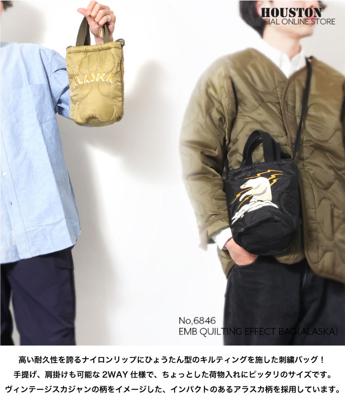メーカー希望小売価格はメーカー商品タグに基づいて掲載しています。>>SPEC スペック 商品 Houston EMB QUILTING EFECT BAG (ALASKA) / 刺繍キルティングエフェクトバッグ(アラスカ) コメント 高い耐久性を誇るナイロンリップに、ひょうたん型のキルティングを施した刺繍エフェクトバッグ! 手提げ、肩掛けも可能な2WAY仕様で、ちょっとした荷物を入れるのに最適なサイズです。 ヴィンテージスカジャンの柄をイメージした、インパクトあるアラスカ柄を採用。 詰め物入りでボリューム感がある可愛い見た目となっています。 男女兼用で使えて、プレゼントにもぴったりのアイテムです♪ サイズ 横幅 高さ 24.0 24.0 サイズ詳細 ・サイズ表の数値単位は「cm」です。 ・サイズはメーカー表記サイズを記載しており、数値に多少の異差が出ます事をご理解下さい。 素材 表地:ナイロン100% 裏地:ナイロン100% 詰め物:ポリエステル100% 生産 中国製 備考 画像はサンプルを撮影した物です。実物も同形同色の商品ですが、若干の異差の有る事をご了解下さい。 ネット環境やブラウザにより、商品画像の色合いが100%表示しきれない場合がございます。