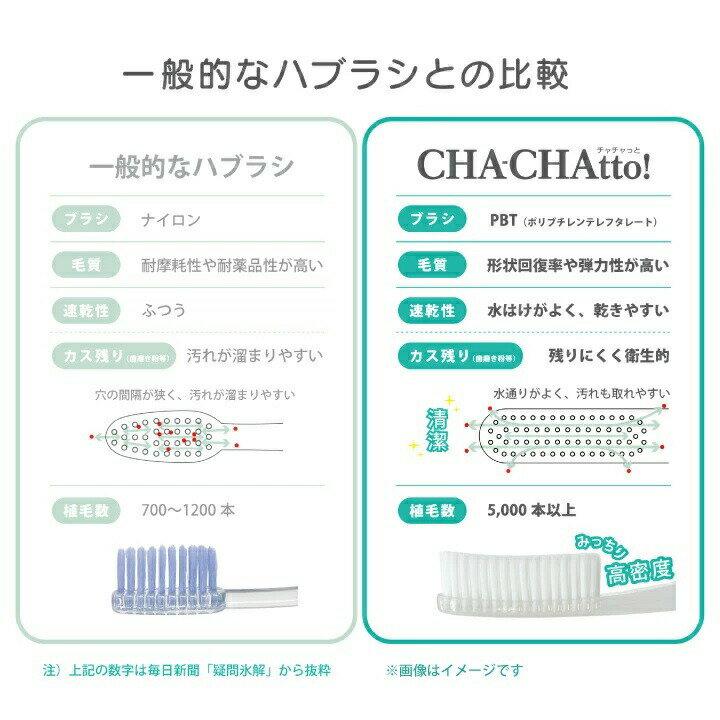 ビタットジャパン オクチ チャチャット 商品説明 『ビタットジャパン オクチ チャチャット』 磨く時間半分!? キレイはそのまま。 「ちゃんと」じゃなくてもいい、チャチャットだから、続けられる。 上下を一気に磨ける。新発想ハブラシ。 【ビタットジャパン オクチ チャチャット 詳細】 原材料など 商品名 ビタットジャパン オクチ チャチャット 原材料もしくは全成分 ポリプロピレン・PBT(飽和ポリエステル樹脂) 内容量 1本入 カラー 色は選べません サイズ 毛の硬さ:やわらかめ 原産国 韓国 販売者 株式会社ビタットジャパン ご使用上の注意 ご使用後はよく水を切ってから保管してください。毛先が開いたら交換する事をおすすめします。 本品はお子様向けでの商品ではありません。 お子様が使用すると、十分な洗浄効果が得られない場合や、口腔内を傷つける可能性があります。 消毒を目的とした長時間の煮沸はお控えください。歯ブラシが変形・劣化の原因となります。 広告文責 株式会社プログレシブクルー072-265-0007 区分 日用品ビタットジャパン オクチ チャチャット 1本入×5個セット