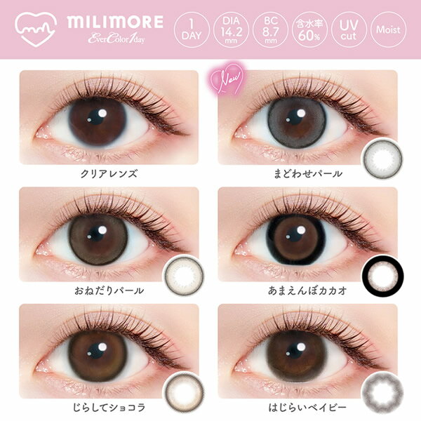 商品詳細 販売名 ミリモア カラー まどわせパール おねだりパール あまえんぼカカオ じらしてショコラ はじらいベイビー 枚数 1箱10枚 使用期間 1日 度数 ±0.00(度なし) -0.50〜-5.00(0.25step) -5.00〜-8.00(0.50step) レンズ直径 14.2mm ベースカーブ 8.7mm 着色直径 13.1mm まどわせパール/おねだりパール 13.2mm じらしてショコラ 13.4mm あまえんぼカカオ 13.6mm はじらいベイビー 含水率 60.0% 特徴・機能 UV効果(UV-A:78%UV-B:96%カット)/うるおい成分配合(MPCポリマー&新うるおい成分)ラップイン構造/非イオン性レンズ/非球面レンズ(ハイディフィニション)/高含水 医療用具承認番号 30200BZX00014A04 区分 高度医療管理機器 製造国 韓国 製造販売元 株式会社アイレ 販売元 株式会社アイセイ 注意事項 当社では複数店舗で在庫を共有しており、システムで在庫調整を行っておりますが、TV放映等による一時的な注文数の増大や、在庫の更新タイミングにより在庫にずれが生じる場合がございます。 在庫更新が間に合わずご注文頂いた商品が欠品となる場合もございます。 欠品が生じた場合や商品の発送が遅れる場合は、改めてご連絡させていただきます。 ご迷惑をお掛けする場合がございますが、あらかじめご了承くださいませ。 広告文責 株式会社エーウィル 0747-26-5566【コンタクトレンズご購入に関する遵守事項】 ●コンタクトレンズは高度管理医療機器です。取り扱い方法を守り正しくご使用下さい。 ●眼科医院等にて検査・装用指導等を必ず受けて下さい。 ●処方を受けられた眼科医院等もしくはお近くの眼科医院等にて定期検診をお受け下さい。 ●眼に異常を感じたら直ちにレンズ使用を中止し、お近くの眼科医院等医療機関を御受診下さい。 ●コンタクトレンズ使用に伴う医学的な眼のトラブルに関しては、当社では医療上の責任を一切負いません。 ●遵守事項を確認し、安全で快適なコンタクトレンズライフを送りましょう。