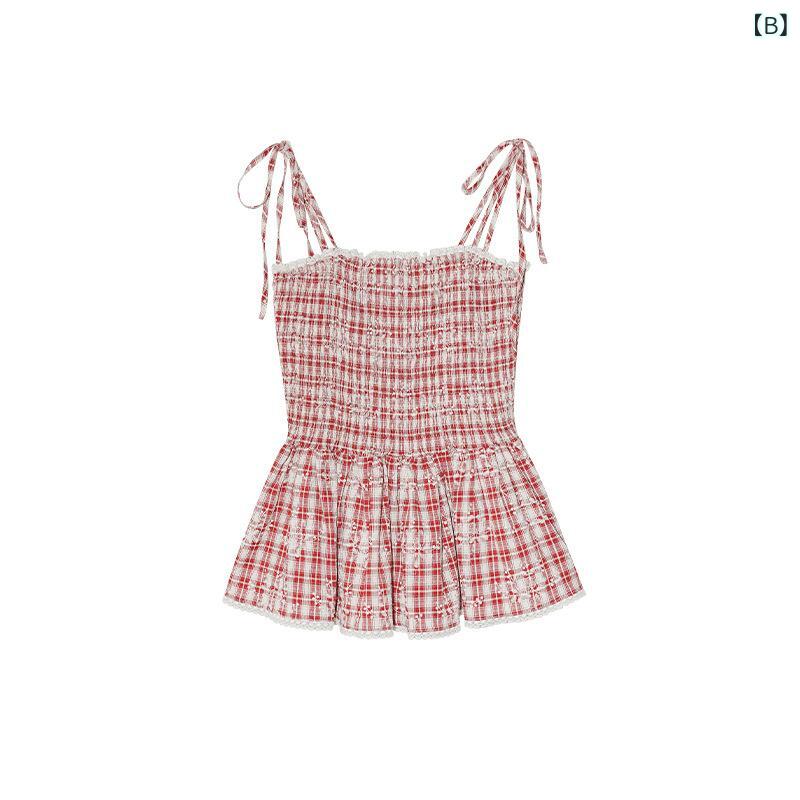 ・デザイン: 吊帯式・シルエット: スリムフィット・着丈: 短め款・パターン: ストライプ/チェック・ディテール: プリーツ・素材: コットン・主素材含有率: コットン50%-70%・色: イエロー,レッド・サイズ: F・スタイル: レトロ風・対象年齢: 成人・スタイルタイプ: 文学的レトロ・ストレッチ: 微弾力・性別: 女性・ストラップ: 紐式肩紐,二本式
