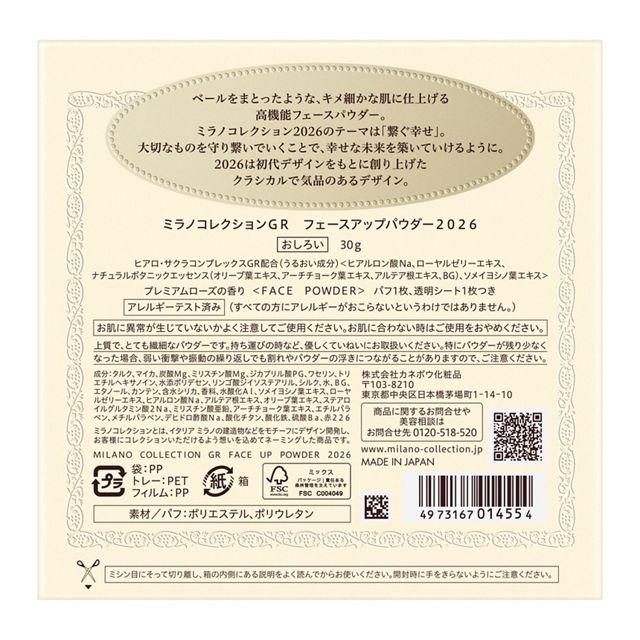 商品名 カネボウ ミラノコレクションGR フェースアップパウダー2026 内容量 ・おしろい 30g ・パフ1枚、透明シート1枚つき 商品説明 ベールをまとったような、キメ細かな肌に仕上げる高機能フェースパウダー。 ミラノコレクション2026のテーマは「繋ぐ幸せ」。 大切なものを守り繋いでいくことで、幸せな未来を築いていけるように。 初代デザインをもとに創り上げたクラシカルで気品のあるデザイン。 天然精油を活かした「プレミアムローズの香り」は華やかで気品に満ちた香りです。 ヒアロ・サクラコンプレックスGR配合(保湿) <ヒアルロン酸Na、ローヤルゼリーエキス、ナチュラルボタニックエッセンス(オリーブ葉エキス、アーチチョーク葉エキス、アルテア根エキス、BG)、ソメイヨシノ葉エキス> 使用方法 ●ファンデーションで仕上げた後に、添付のパフにパウダーをとり、お肌に軽くおさえるようにしてつけていきます。お手持ちのフェースブラシでもお使いいただけます。 ●お化粧直しには、まず余分な皮脂や汗をティッシュペーパー等で軽くおさえてからお使いください。 ●同梱の透明シートはお捨てにならず、パフ置きとしてケースの中に収納してお使いください。透明シートは、内側のシートをはがし、内側のシートの切り込み部分を立ててお使いください。(外側のシートはお捨てください。) ●使い終わった中皿は、ケース底の穴をピンなどで押して取り出すことができます。 <お願い> ●美しい仕上がりのために、パフはいつも清潔にしてお使いください。 ●パフが汚れたままお使いになると、パウダーがつきにくくなったり、パウダー表面が固くなる場合がありますのでご注意ください。 ●パフが汚れたら、中性洗剤を薄めたぬるま湯で軽く押し洗いをし、よくすすいだあと、タオル等で水気をとり、必ず陰干ししてください。 ●替えパフには、別売りのカネボウ パフ《ミラノコレクション フェースアップパウダー用L》をお使いください。 ●ご使用後は、フタをきちんとしめてください。 成分 タルク、マイカ、炭酸Mg、ミリスチン酸Mg、ジカプリル酸PG、ワセリン、トリエチルヘキサノイン、水添ポリデセン、リンゴ酸ジイソステアリル、シルク、水、BG、エタノール、カンテン、含水シリカ、香料、水酸化Al、ソメイヨシノ葉エキス、ローヤルゼリーエキス、ヒアルロン酸Na、アルテア根エキス、オリーブ葉エキス、ステアロイルグルタミン酸2Na、ミリスチン酸亜鉛、アーチチョーク葉エキス、エチルパラベン、メチルパラベン、デヒドロ酢酸Na、酸化チタン、酸化鉄、硫酸Ba、赤226 使用上の注意 ●傷やはれもの、湿疹等異常のあるところにはお使いにならないでください。 ●お肌に異常が生じていないかよく注意してご使用ください。化粧品がお肌に合わない時は、使用を中止してください。 1.使用中、赤み、はれ、かゆみ、刺激、色抜け(白斑等)や黒ずみ等の異常があらわれた場合。 2.使用したお肌に、直射日光があたって上記のような異常があらわれた場合。 そのまま化粧品類の使用を続けますと、症状を悪化させることがありますので、皮フ科医にご相談されることをおすすめします。 ●目に入らないように注意し、入った時は、すぐに充分洗い流してください。 ●子供や認知症の方などの誤食等を防ぐため、置き場所にご注意ください。 発売元・メーカー 株式会社カネボウ化粧品 〒103-8210 東京都中央区日本橋茅場町1-14-10 お客様窓口:0120-518-520 受付時間:9:00〜17:00(土日・祝日を除く) 区分・原産国 化粧品・日本 広告文責 株式会社ライズコーポレーション TEL:03-5542-1285