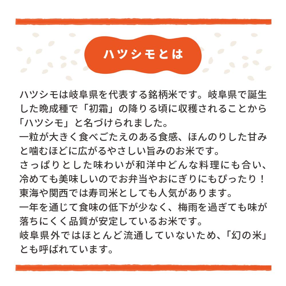 毎日のごはんを、もっと美味しく。 岐阜県の米どころ 輪之内町 から、大粒でふっくらとした「ハツシモ」を直送します。 家族みんなのお食事に 毎日のお弁当やおにぎりに 冷めても美味しいので、朝炊いたごはんが夜まで美味しくいただけます ハツシモとは ハツシモは岐阜県を代表する銘柄米です。 岐阜県で誕生した晩成種で「初霜」の降りる頃に収穫されることから「ハツシモ」と名づけられました。 一粒が大きく食べごたえのある食感、ほんのりした甘みと噛むほどに広がるやさしい旨みのお米です。 さっぱりとした味わいが和洋中どんな料理にも合い、冷めても美味しいのでお弁当やおにぎりにもぴったり! 東海や関西では寿司米としても人気があります。 一年を通じて食味の低下が少なく、梅雨を過ぎても味が落ちにくく品質が安定しているお米です。 岐阜県外ではほとんど流通していないため、「幻の米」とも呼ばれています。 保存方法 直射日光・高温多湿を避け、冷暗所にて保存してください。 夏場は冷蔵庫(野菜室)での保存をおすすめします。 名称 玄米(ハツシモ) 品種 ハツシモ 産地 岐阜県安八郡輪之内町 産年 令和7年産 内容量 5kg