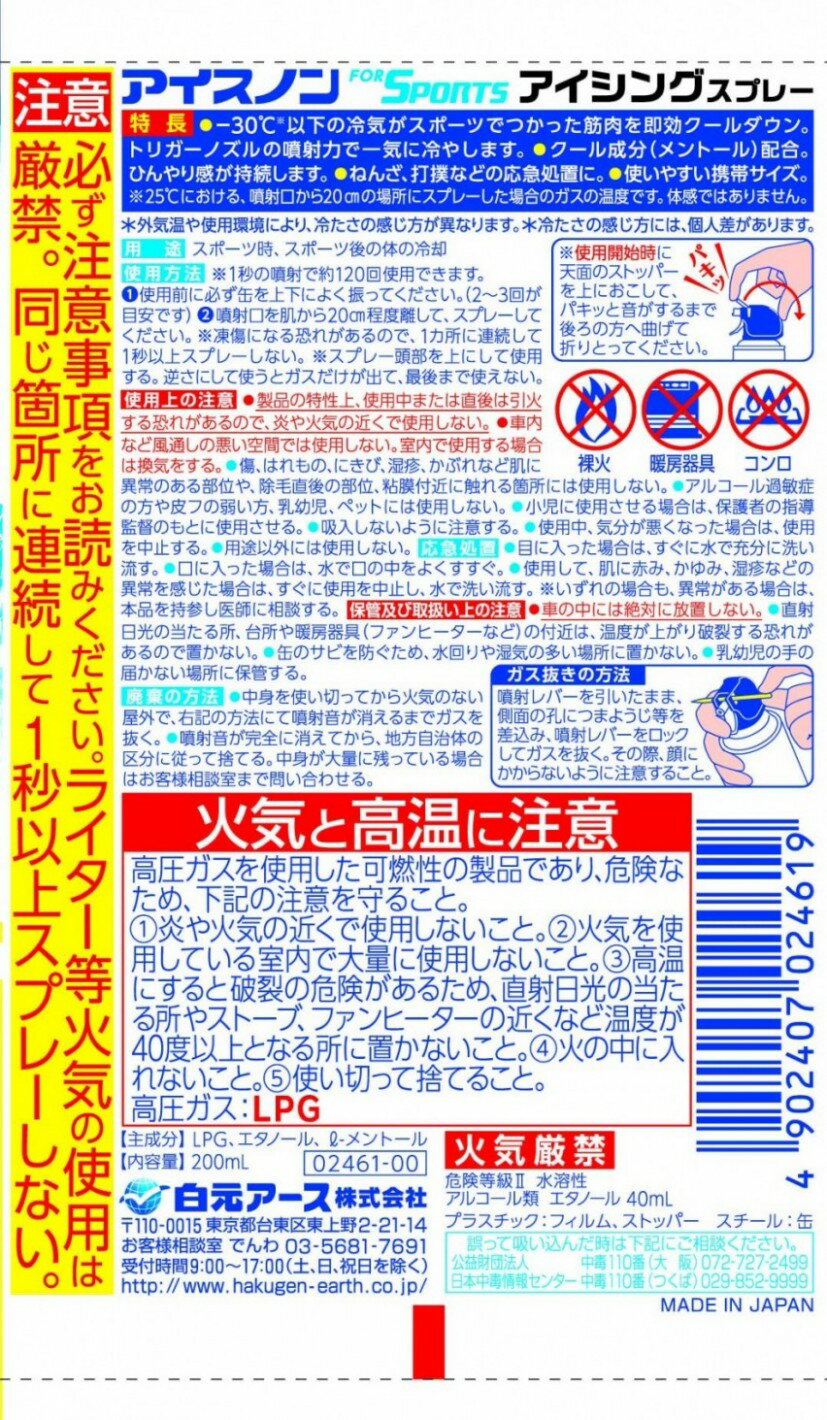 商品説明■ ●-30℃以下の冷気がスポーツで使った筋肉を即効クールダウン。トリガーノズルの噴射力で一気に冷やします。 ●クール成分(メントール)配合。ひんやり感が持続します。 ●ねんざ、打撲などの応急処置に。 ●使いやすい携帯サイズ。 ●1秒の噴射で約120回使用できます。