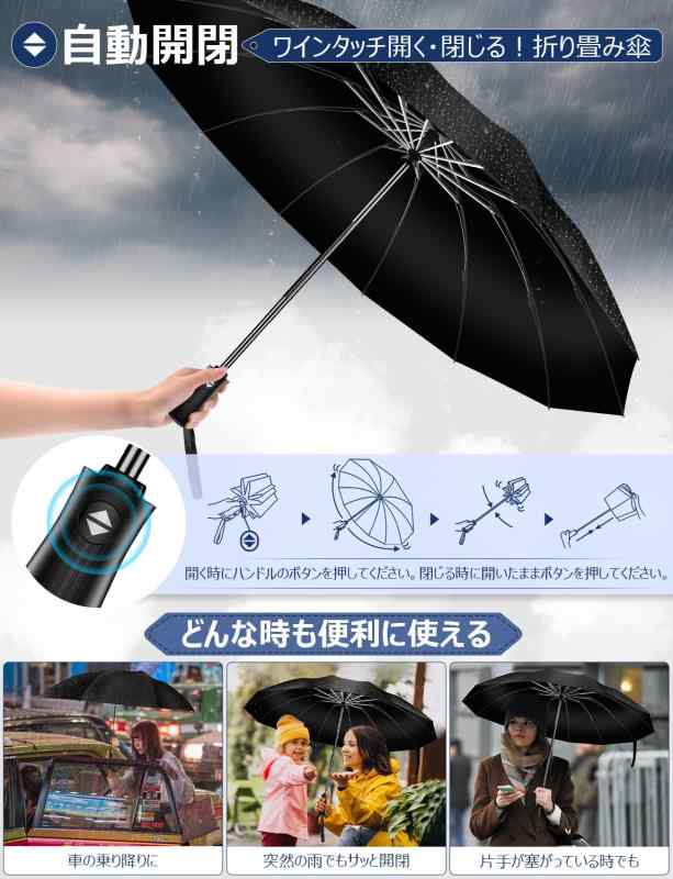 【強化型12本骨 & 逆折り式】折りたたみ傘 折り畳み傘 ワンタッチ 自動開閉 逆折り式 おりたたみ傘 UPF50+ 折りたたみ日傘 超撥水 メンズ傘 超大サイズ 大きい 長持ち 耐強風設計 男子日傘 ☂急な雨の際にあると便利な「折りたたみ傘」。✅【ワンタッチ自動開閉&片手で楽】業界最新な技術を採用されています、ボタンを押すだけで傘を開いたり閉じたりできます。片手でも簡単に開閉できます。傘を閉じる時に撥ねてくる雨粒で袖が濡れる気まずさにさようなら突然雨が降り出したけど、傘を開くのに手間取り濡れてしまったという経験がある人も多いのではないでしょうか。ワンタッチ自動開閉式なので、スピーディに開けられます。雨の日の車の乗り降り、子供を抱きかかえている時や荷物の多いときも楽です。外回りの仕事、突然の夕立にもサッと広げる事が出来、いつでも安心しています。(ご注意:密封することにより少し折りたたみ傘特有のニオイがありますが、健康に影響はございませんので、安心してご使用ください。ニオイが気になる場合は風通しの良い場所に1、2日置いておくとニオイも気にならなくなります。)☂超人気濡れない「逆折り式傘」。✅【濡れない逆折り式傘&カバー付き】通常の傘は濡れた部分が外側になりますが、逆折り式傘は、閉じたときに濡れた部分が内側になるというユニークな傘。手が濡れない傘として人気です。閉じる際に手が濡れにくく、人混みや電車の中でも、まわりが濡れないように気を遣う必要がないこと。衣服・荷物・車のシートなどを濡らしたくないときにも便利です。さらに、高撥水生地を採用し、水をはじきやすく、軽く振るだけで雨水を落とすことができます。カバーや袋付きなので、使用後すぐにカバンに収納できます。ホコリや汚れから傘をガードできるほか、使ったばかりの傘をしまっても服やバッグを濡らしません。より一層便利さが進化した折り畳み傘です。電車やバスなど公共交通機関を利用する方におすすめです。☂12本超強靭な骨組みで「強化型傘」。✅【12本骨強化型&強風耐久性】様々な意見をまとめて、Bigmax新作の晴雨兼用傘ががようやく登場男性の方が求める機能を全て取り入れた究極のメンズ傘です。柔軟性と強度を併せ持つ12本親骨を採用し、普通の8傘本骨より、耐風性と耐久性ともに向上させた、防食加工が施された傘のフレームは超強靭で錆びにくい上に、強風にあおられても豪雨に打たれても折れたり曲がったりしにくいです。3段折り構造により、強風で裏返ってもちゃんと元に戻ります。安易に折れたり曲がったりする心配ありません。梅雨はもちろん、豪雨、強風にも安心できます。(通常の傘より少し重いですが、機能を重んじて傘の強度と大きさを求めて作られています。重さに気になる方は何卒ご理解のほどよろしくお願い致します。)☂メンズ向けの「超大サイズ傘」。✅【ビッグサイズ&二人でも余裕】傘は雨に濡れないように体やカバンを守るもの。そこで開いた時の大きさ=傘を広げた時の直径が最も重要なポイントです。弊社の折り畳み傘はメンズ向けに、驚いた曲面長さは直径105cm、弧長115cmまで達しています。傘を傾けても垂直に差しても体が濡れにくく、体の大きな男性としても窮屈さを感じることなく快適に使えます。雨を防げる範囲が大きくので、二人で荷物を持って傘に入っても余裕があるほどの大きさです。あると便利な玉留め付きで、畳むとかなり細目に収まるカバンに置いても濡れる心配はありません。ビジネス時もスマートな印象です。ビジネスシーンから普段使いまで様々な環境下にて活躍してくれます。雨の日を快適に過ごしましょう。☂日傘としても使える「晴雨兼用傘」。✅【紫外線・暑さ対策&夏日通勤の重宝】厚めのナイロン生地に特殊コーディング加工を施し、紫外線を99%以上カットできる折り畳み傘です。内側を暗い色にすることで、地面の照り返しを吸収するので、上からも下からの紫外線も防ぐ効果があります。日焼けから守ってくれます。日差しが通さず遮光性パッチリで、眩しい感じも軽減します。ますます暑くなる夏日に、落ち着いたイメージで男性が日傘として使っても違和感がなく、熱中症予防にも役立ちます。雨の日だけでなく、暑い季節の通勤に日傘としても活用可能。晴雨兼用として一年中お使いいただける折り畳み傘です。
