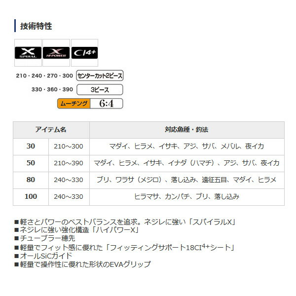 快適な操作性を追求したムーチングアクション。6:4調子のオールラウンダー。スパイラルXとハイパワーXを搭載したカーボンブランクスは、軽量&高感度でムーチングアクションでありながら優れた操作性を発揮。6:4調子に求められる仕掛けの安定性や細ハリスへの対応力は維持しながら、手持ちで軽快なシャクリ操作やアワセ操作が可能。リールシートには軽量でパーミング性能に優れたフィッティングサポート18CI4+を採用。シマノロッドテクノロジーを惜しみなく搭載した汎用性の高いモデルは、日本各地のさまざまな対象魚、釣法に対応します。《お取り寄せ》商品に関しまして、お待ち頂ける方は予約受付致します/ご連絡下さい。☆★掲載写真は参考掲載です!★☆ お譲りする商品は【上記タイトル記載商品】1点のみです。お間違いのないようお願い致します。◆スペック表 本体価格には消費税は含まれておりません◆■◆保証書付です◆■メーカー希望小売価格はメーカーサイトに基づいて掲載しています