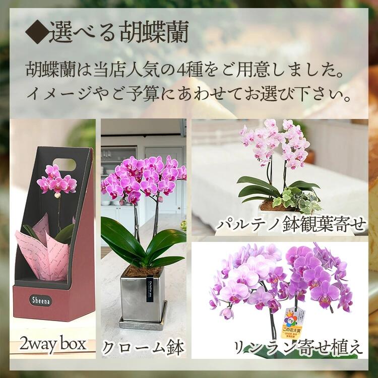 商品情報 胡蝶蘭のサイズ(生花のため個体差があります) 【2WAY BOX】 ・1本立 2.5号 ・高さ30cm×幅12cm ・BOXサイズ 18×18×45cm 【クローム鉢】 ・2本立 4号 ・高さ40-45cm×幅20cm※葉を含む 【パルテノ鉢】 ・2本立 5.5号 ・高さ40-45cm ・陶器鉢 【リンラン寄せ】 ・2本立 4.5号 ・高さ40-45cm【George Steuart Tea】セット商品のご案内