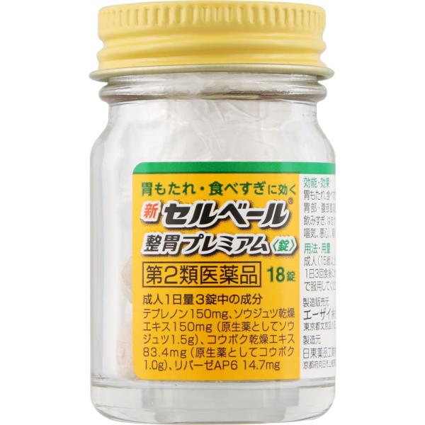 使用上の相談点相談すること1.次の人は服用前に医師、薬剤師又は登録販売者に相談してください。(1)医師の治療を受けている人(2)妊婦又は妊娠していると思われる人(3)高齢者(4)薬などによりアレルギー症状を起こしたことがある人(5)次の診断を受けた人肝臓病2.服用後、次の症状があらわれた場合は副作用の可能性があるので、直ちに服用を中止し、この説明書を持って医師、薬剤師又は登録販売者に相談してください。関係部位・・・症状皮膚・・・発疹、発赤、かゆみ消化器・・・腹部膨満感、はきけ、腹痛精神神経系・・・頭痛その他・・・皮下出血まれに下記の重篤な症状が起こることがあります。その場合は直ちに医師の診療を受けてください。症状の名称・・・症状肝機能障害・・・発熱、かゆみ、発疹、黄疸(皮膚や白目が黄色くなる)、褐色尿、全身のだるさ、食欲不振等があらわれます。3.服用後、次の症状があらわれることがあるので、このような症状の持続又は増強が見られた場合には、服用を中止し、この説明書を持って医師、薬剤師又は登録販売者に相談してください。便秘、下痢、口のかわき4.2週間位服用しても症状がよくならない場合は服用を中止し、この説明書を持って医師、薬剤師又は登録販売者に相談してください。効能・効果胃もたれ、食べすぎ、食欲不振、胃部・腹部膨満感、胸やけ、飲みすぎ、はきけ(むかつき、嘔気、悪心)、嘔吐、胸つかえ成分・分量成人1日量3錠中に次の成分を含みます。テプレノン・・・150mg(胃粘液を増やして食事や胃酸による刺激から胃を守ります。)ソウジュツ乾燥エキス(原生薬としてソウジュツ)・・・150mg(1.5g)コウボク乾燥エキス(原生薬としてコウボク)・・・83.4mg(1.0g)(弱ってしまった胃の運動を活発にします。リパーゼAP6・・・14.7mg(胃もたれの主な原因となる脂肪の消化を助けます。)[添加物]タルク、ビタミンE、部分アルファー化デンプン、エリスリトール、ケイ酸Ca、ポビドン使用上の注意点-商品詳細胃もたれ、食べすぎに弱ってきた胃を整える胃ぐすり最近、胃が弱ってきたと感じる、このような方におすすめです。・食後に胃もたれを感じることが多くなった方・少ない量でも食べすぎたと感じるようになった方弱ってきた胃の原因のひとつは胃粘液の減少です。胃を守るテプレノンを増量し処方強化した新セルベール整胃プレミアム〈錠〉は、3つの働きで胃もたれなどの弱ってきた胃の症状を改善します。守る・・・胃の粘膜を覆ったベール「胃粘液」を増やして、胃を守ります。動かす・・・胃の運動を活発にします。消化する・・・脂肪を分解して、消化する力を高めます。新セルベール整胃プレミアム〈錠〉は、1回1錠で効く飲みやすい錠剤です。保管及び取扱上の注意点1.直射日光の当たらない湿気の少ない涼しい所に密栓して保管してください。2.小児の手の届かない所に保管してください。3.他の容器に入れ替えないでください。また、本容器内に他の薬剤等を入れないでください。(誤用の原因になったり品質が変わります。)・ピルケース等に入れ替えることにより、製品や容器の品質に影響をおよぼすことがあります。4.湿気により錠剤の外観が変化するおそれがありますので、ぬれた手で触れないでください。5.容器内の詰め物は、輸送中の錠剤破損防止用です。容器のキャップを開けた後は捨ててください。6.使用期限をすぎた製品は使用しないでください。7.使用期限内であっても一度容器のキャップを開けた後は、品質保持の点から6ヵ月以内を目安に使用してください。箱の内ブタの「開封年月日」欄に、開封日を記入してください。用法及び用量【用法・用量】次の量を食後に水またはお湯で服用してください。成人(15歳以上)・・・1回量1錠、服用回数1日3回小児(15歳未満)・・・服用しないこと商品サイズ高さ43mm×幅80mm×奥行き40mm剤型・形状錠剤問合せ先●エーザイ株式会社「hhcホットライン」東京都文京区小石川4?6?100120?161?454受付時間/平日9:00?18:00(土・日・祝日9:00?17:00)