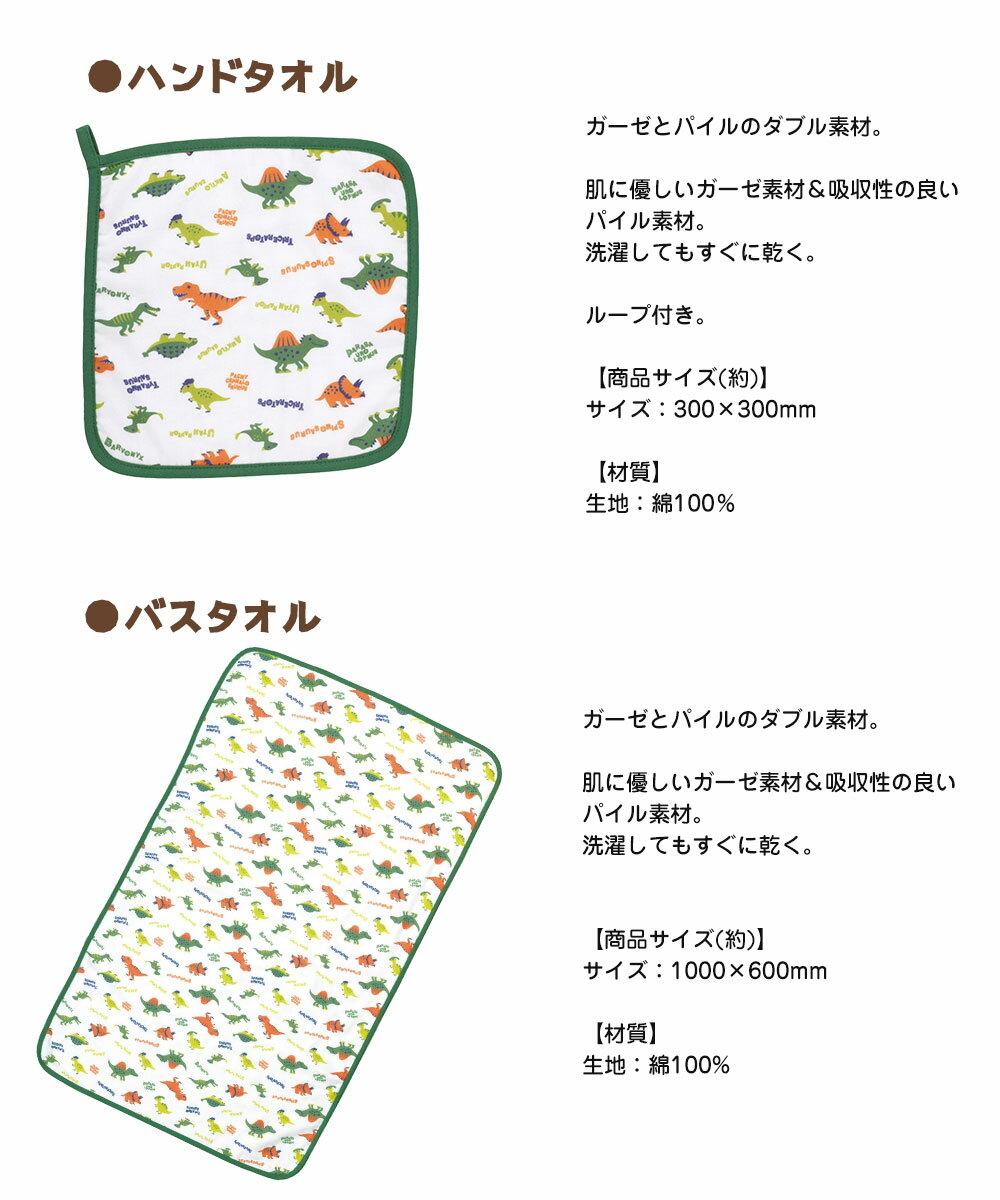 ●セット内容 BHT1 ハンドタオル BGBT1 バスタオル ○BHT1 ハンドタオル ガーゼとパイルのダブル素材。 肌に優しいガーゼ素材&吸収性の良いパイル素材。 洗濯してもすぐに乾く。 ループ付き。 【商品サイズ(約)】 サイズ:300×300mm ※商品の性質上、多少誤差が生じることがあります。あらかじめご了承ください。 【材質】 生地:綿100% ※漂白剤・ベンジン・シンナー等は使用しないでください。 ●中国製 ○BGBT1 バスタオル ガーゼとパイルのダブル素材。 肌に優しいガーゼ素材&吸収性の良いパイル素材。 洗濯してもすぐに乾く。 綿100% 【商品サイズ(約)】 サイズ:1000×600mm ※商品の性質上、多少誤差が生じることがあります。あらかじめご了承ください。 【材質】 生地:綿100% ※漂白剤・ベンジン・シンナー等は使用しないでください。 ●中国製 ディノサウルス ■関連ワード■ SKATER スケーター ラッピング無料 メッセージカード無料 キッズ おくり物 内祝い お返し 入学 お祝い品 誕生祝い 出産準備 ベビー用品 幼稚園 保育園 入園準備 入園祝 孫 贈りもの 親戚 男の子用 女の子用 誕生日 こどもの日 クリスマス プレゼント ギフト 出産祝い バースデー ハーフバースデー 記念 記念日 御祝い お祝い 御祝 お祝 ※当店では在庫一括管理システムにより複数店舗の在庫を共有しております。 ご注文の殺到などの影響で、在庫数の自動更新システムのタイミングにより、 既に完売した状態でも一時的にまだご注文できる状態のままとなり、 商品のご用意が出来ない場合もございます。予めご了承ください。 ※本商品はご注文タイミングやご注文内容によっては、 購入履歴からのご注文キャンセル、修正を受け付けることができない場合がございます。 ●返品・交換についてはこちら ※メーカー希望小売価格はメーカーカタログに基づいて掲載しています。
