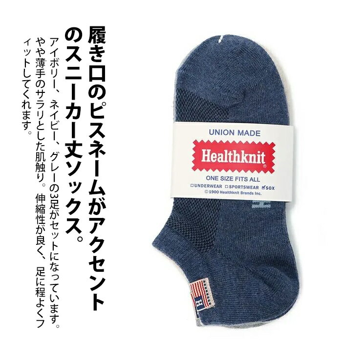 ITEM詳細 Brand Name Healthknit ヘルスニット ヘルスニット一覧はこちら Item Name ワンポイント ピスネーム アンクル丈 3Pソックス [Lot/191-3710] 備考 【3,980円(税込)以上ご購入で送料無料】※沖縄・離島・山間部を除く 【コンビニ受取対応商品】【コンビニ受け取り】 【ギフト対応】 Evidence メーカー希望小売価格はメーカー商品タグに基づいて掲載しています。 Situation [お祝い・プレゼントにも]プレゼント ギフト 父の日 母の日 クリスマス 記念日 バレンタイン ホワイトデー 誕生日 バースデー 入学 卒業 就職 退職 祝 祝い 御祝い 歓迎会 送別会 Word Healthknit ヘルスニット ヘルスニットロゴ ロゴ 刺繍 アンクル丈 スニーカー丈 ショート丈 ソックス 靴下 Socks 足首 3足セット セット カジュアル ブランド おしゃれ メンズ 男性 大人 アメカジ ストリート 丈夫 頑丈 タフ ギフト 贈り物 プレゼント ギフト 通学 学生 3P 3足組 グレー ネイビー アイボリー フェス イベント お出かけ 旅行 シンプル 定番 ブランド シンプル 春 夏 秋 冬 オールシーズン 通年 学校 男性 紳士靴下Healthknit ヘルスニット Healthknit 世界中で愛される創業100年以上の老舗 ウェアブランド Healthknit(ヘルスニット)は、1900年、テネシー州ノックスヴィルでスタンダードニッティングミルズ社の高品質アンダーニットウェアーメーカーとして誕生しました その製品作りは、世界的に有名なアメリカ南部の上質な原料を採用し、紡績からソーイングまで一貫した生産管理の下で行われます。 その中でも特に代表的な3つボタンヘンリーネックTシャツは、完成から100余年を経て、世界中で最もスタンダードなアメリカンニットウェアとして親しまれ、現在では他メーカーから素材やカラーを変え同様の商品が生産されていますが、 このヘルスニットの3つボタンヘンリーネックTシャツはアメリカが作ったベーシックアンダーウェアのプロト的存在とまで言われ賞賛されています。 サイズ cm ONE SIZE 25.0-27.0 ※上記のサイズ表はメーカーに記載されている数値です。 ※個体差などにより実際のサイズと多少の誤差が生じる場合がございます。 ※可能な限り商品色に近い画像を選んでおりますが、閲覧環境等により画像の色目が若干異なる場合もございます。その旨をご理解された上でご購入ください。 ※サイズに関しての交換・返品につきましては、送料がお客様負担となりますので、あらかじめご了承下さい。 ブランド Healthknit/ヘルスニット 商品名 ワンポイント ピスネーム アンクル丈 3Pソックス 品番 191-3710 商品説明 履き口のピスネームがポイントのスニーカーソックス。アイボリー、ネイビー、グレーの3足セットです。 やや薄手のサラリとした肌ざわり。伸縮性が良く、足に程よくフィットしてくれます。 カラー アイボリー / ネイビー / グレー 素材 綿 / ポリエステル / ポリウレタン 生産国 中国 洗濯表記