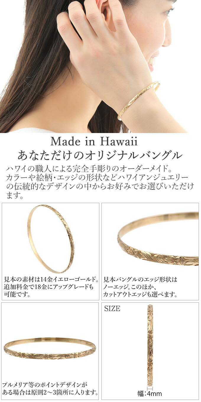 ◆ オーダーメイド ハワイアンジュエリー バングル4mm幅 x 1.5mm厚 ◆ 詳細 ・バングル幅4mm×バングル厚1.5mm ・バレルタイプ 世界にたったひとつだけのジュエリーをあなたへ… LMAハワイアンジュエリーのオーダーメイド商品は、ハワイの職人による全て「手作り」です。あなたのみの一点ものでございます。一生もののジュエリーとして大切にしていただきたいと思っております。こちらのバングルは4mm幅x1.5mm厚のバングルとなります。(カットアウトの場合は一番幅の広い部分が4mmとなります)バングルのデザインは上記をご覧くださいませ。ご希望の素材・デザインでバングルをお作りすることが出来ます。ご希望のサイズにより価格が変更になります。他の幅、厚みもございます。オプションでダイヤモンド2個(2箇所)を入れることも可能です。バングルの裏(内側)に刻印(英数大文字)をご希望の場合には、ご注文前にお問合わせください。注文確定後、ハワイにて作成を開始いたします。ご注文確定後の変更、キャンセルが出来ませんので予めご了承くださいませ。その他、ご不明な点やご質問等ございましたらお気軽にお問い合わせくださいませ。メールアドレスordermail@locomoco-j.com 【モデル装着商品】 素材:14Kイエローゴールド形状:バレル幅:4mm縁(エッジ):ノーエッジ 素材 【イエローゴールド】【ホワイトゴールド】【ピンクゴールド】のいずれかから1種お選びいただけます。14K・18Kいずれにも対応可能。 サイズ サイズは「バングルサイズ表」画像を参考に計測頂き、USサイズ(インチ)でご注文を承ります。ご希望のバングルサイズがない場合やご不明な点はお気軽にお問い合わせくださいませ。 ご注意 実際の商品になるべく近い色を再現しておりますが、ご覧になっているモニターの色の違い等により、実際の商品と色味が若干異なる場合がございます。あらかじめご了承ください。サイズ表記は手作業にて行っておりますので、実物と若干の誤差が生じる場合があります。 商品到着後レビュー記載で7%オフになります!レビューのご記入を心よりお待ちしております。■K10,14,18ゴールド(イエロー)・ピンクゴールド・ホワイトゴールド・グリーンゴールドの商品温泉や海に入る時には必ず外してください。変色の原因になります。■シルバー925(無垢)の商品温泉や海に入る時には必ず外してください。変色の原因になります。■シルバー925ロジウムコーティング・ピンクゴールドコーティング・イエローゴールドコーティングの商品温泉や海に入る時には必ず外してください。変色の原因になります。市販の研磨剤入りシルバー磨きなどでゴシゴシと磨かれますとロジウムコーティングやピンクゴールドコーティング・イエローゴールドコーティングがはがれてしまうことがあります。ご注意ください。コート(メッキ)がはがれる原因になりますので浸けるタイプのシルバー洗浄液はご使用にならないでください。 卒業祝 入学祝 入社祝 ホワイトデーなどにお勧めです。 【通年ギフトにも対応しております】プレゼント X'mas Xmas 誕生日祝い 誕生日プレゼント バースデープレゼント 結婚祝い 結婚内祝い 出産祝い 出産内祝い 長寿祝い 結婚記念日 内祝 御祝 祝還暦 バレンタインデー ホワイトデー ホワイトデーお返し 入学祝い 卒業祝い 母の日 母の日プレゼント 母の日ギフト 父の日 父の日のプレゼント 父の日ギフト 自分へのご褒美 ハロウィン リングサイズ:2号、3号、4号、5号、6号、7号、8号、9号、10号、11号、12号、13号、14号、15号、16号、17号、18号、19号、20号、21号、22号、フリー、リングによりましてご用意しているサイズが異なります。 買いまわり 買い回り福袋ではないけれど、福袋のようにお買い得にお買い物をしていただきたくて、↓ 他の幅・厚みのオーダーメイドバングルはこちら ↓ 【金素材の商品に関して】地金の高騰により、金の仕入れ価格の変動が大きく、仕入れ時期により、価格を変動させて頂く場合があります。できる限り社内努力により、現行価格の維持には務める所存ではおりますが、何卒、ご理解のほどお願い申し上げます。(ご決済後の価格変更はございませんので、ご安心ください)