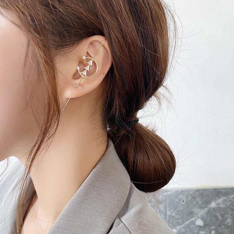 キラキラのクリスタルのキュービックジルコニアをセットした三日月型のリングフレームに三角形のトライアングルを3個セットした金色ゴールドのイヤークローラータイプのファッションピアス。 先端を杖のようにカーブさせたユニークで個性的な形状のイヤーカフピアス。耳の上からぶら下げるように装着し、先端をピアスホールに差し込むイヤーカフピアスはボディピアスの人気のピアッシング、インダストリアルのようです。 ポストサイズも20G(20ゲージ)とファッションピアスサイズなので、簡単に装着できる。 もちろん耳にかけるだけでピアスホールがなくても装着できるノンホールピアスとしても使えます。耳からぶら下がるモチーフが存在感をアピールしてくれるクローラーラップ。 メンズでもレディースでも使えるのでペアルックやプレゼントにもおすすめのイヤークライマー。 結婚式や披露宴、入学式や成人式でも使えるイヤリングです。 スペック全体の大きさ:約16mmx63mm 素材真鍮メッキ備考・表示は1個の価格です。・ハンドメイドの為多少サイズは異なります。