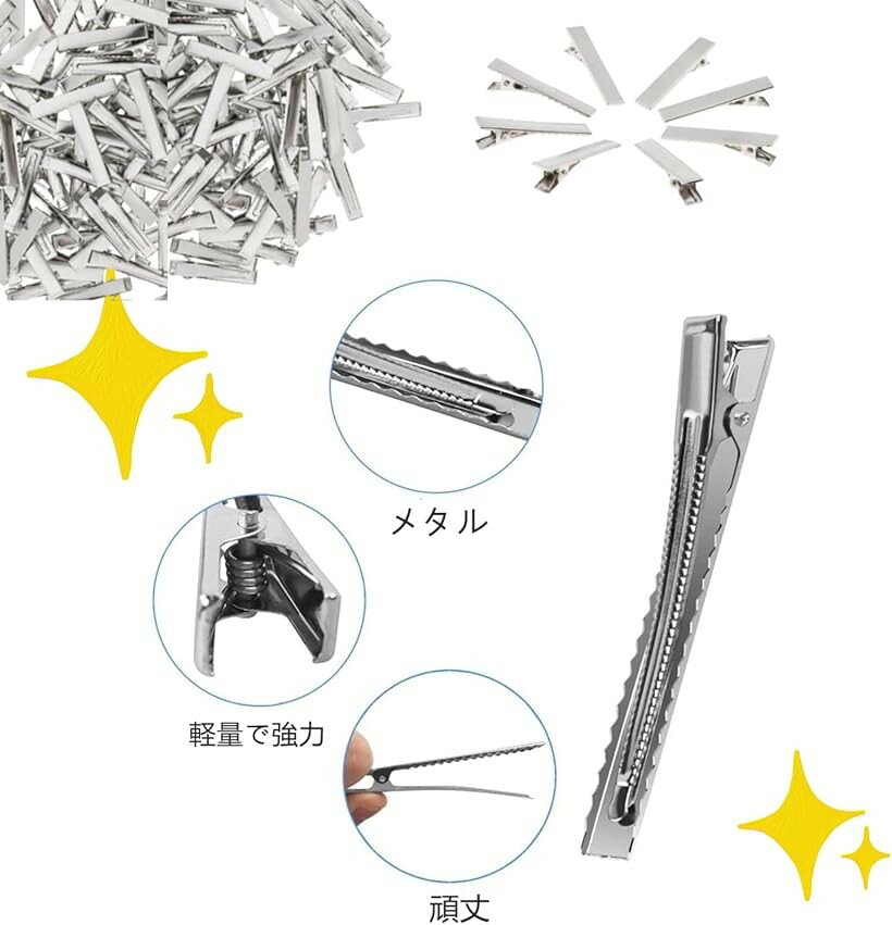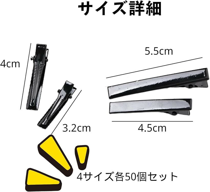 「多用途で便利」lulubelleのヘアクリップは、DIYやホビー、業務用として幅広く活用できます。大人から子供まで、誰でも簡単に使えるため、日常のスタイリングや特別なイベントでのアレンジに最適です。シンプルなデザインがどんなスタイルにもマッチし、使うたびに新しい魅力を引き出します。「高品質な素材」3.2-5.5mmの金具は、耐久性に優れた素材で作られており、長時間の使用でもしっかりと髪をホールドします。これにより、スタイルが崩れる心配がなく、安心して日常の活動を楽しむことができます。高品質な素材が、プロフェッショナルな仕上がりを実現します。「コストパフォーマンス」 4サイズ各50個セットのセットは、コストパフォーマンスに優れています。大量に必要な業務用としても、個人のDIYプロジェクトとしても、十分な数量が揃っているため、経済的に利用できます。これにより、予算を気にせずに創造的な活動を楽しむことができます。簡単な使用感」シンプルな構造で、誰でも簡単に取り扱うことができます。髪に優しく、スムーズに装着できるため、忙しい朝のスタイリング時間を短縮します。これにより、毎日の準備がスムーズになり、時間を有効に活用できます。*注意ください* ・写真の写り方により、実際の商品と異なって見える場合がございます。・サイズにつきましては若干の誤差が生じる場合がございます。・生産時期により、商品のデザインが若干異なる場合がございます。上記予めご了承の上お買い求めくださいませ。※ 他ネットショップでも併売しているため、ご注文後に在庫切れとなる場合があります。予めご了承ください。※ 品薄または希少等の理由により、参考価格よりも高い価格で販売されている場合があります。ご注文の際には必ず販売価格をご確認ください。※ 沖縄県、離島または一部地域の場合、別途送料の負担をお願いする場合があります。予めご了承ください。※ お使いのモニタにより写真の色が実際の商品の色と異なる場合や、イメージに差異が生じることがあります。予めご了承ください。※ 商品の詳細(カラー・数量・サイズ 等)については、ページ内の商品説明をご確認のうえ、ご注文ください。※ モバイル版・スマホ版ページでは、お使いの端末によっては一部の情報が表示されないことがあります。すべての記載情報をご確認するには、PC版ページをご覧ください。「セット」: 4サイズ各50個セット