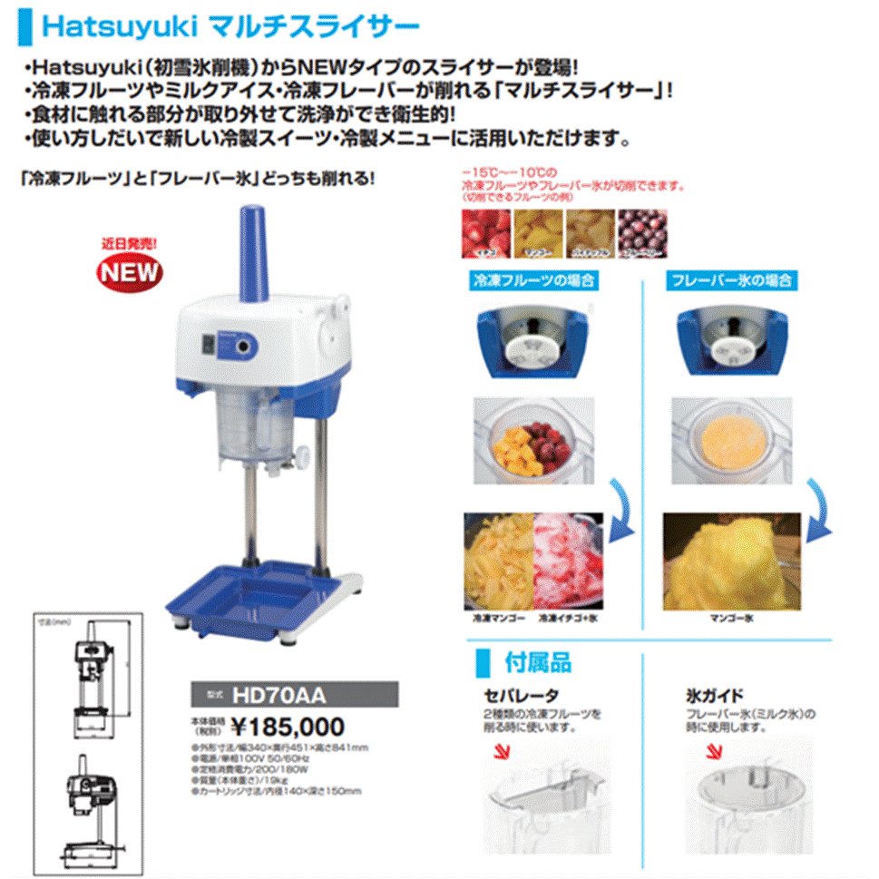■こちらは【代引不可】の商品です。ご注文の際はご注意下さい。■お取り寄せ商品の為、メーカー欠品の場合はご用意できない場合がございます。外径寸法:幅340×奥行451×高さ841mm電源:単相100V 50/60Hz定格消費電力:200/180W質量(本体重さ):19Kgカートリッジ寸法:内径140×深さ150mm☆Hatuyuki(初雪氷削機)からNEWタイプのスライサー登場!☆冷凍フルーツやミルクアイス・冷凍フレーバーが削れる「マルチスライサー」☆食材に触れる部分が取り外せて洗浄が衛生的!☆使い方次第で新しい冷製スイーツ・冷製メニューに活用いただけます。☆−15℃〜−10℃の冷凍フルーツやフレーバー氷が切削できます。※お取り寄せ商品の為、メーカー又は仕入先より直送になります。※お急ぎの場合は、在庫確認にお気軽にお問合せくださいませ。※仕入れ先欠品の際は、長期欠品する場合がございます。※メーカー在庫がある場合は、注文確定後2-5営業日以内での発送予定です。