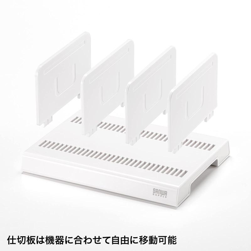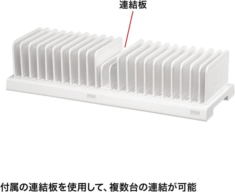 サンワサプライ(Sanwa Supply) タブレット・スマートフォン用スタンド(10台収納タイプ) PDA-STN20WN設置機器に合わせて仕切板の取付位置を自由に調整できるタブレット・スマートフォン用スタンドです。仕切板は5mmピッチで自由に取付位置の調整ができるので、ケース付きのタブレットや種類の異なる複数の機器の設置にも対応します。省スペースに最大10台までの機器を設置できます。付属の連結板を使用することでスタンドを複数台連結でき、設置台数を拡張することができます。本体底面には滑り止め付きでしっかりと安定します。