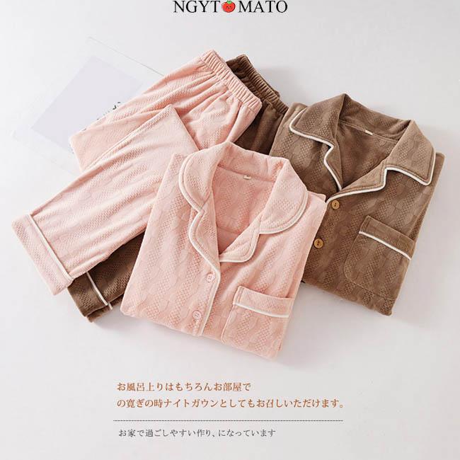 フロントオープンデザインで着脱が簡単です。 折り目付きのデザインは、首元が窮屈に感じられないように、より余裕を持って寝やすいデザインです。 袖口の幅はちょうどいいデザインで、柔らかい素材が手首の生地の摩擦を減らし、寝やすくします。伸縮性のあるウエストゴムで着替えもラクラク。部屋着?ルームウェアとしても大活躍。ゆったりと着やすいゆとりあるシルエットで着こなせ、リラックスタイムやパジャマにもぴったり。軽量なのに保温性抜群で、寒い冬の夜も快適に過ごせます。注意事項*インターネット販売では、実際に商品を見ていただけない販売方法だからこそ、実物により近づける様できるだけ解りやすい商品ページ製作に努めております。 しかし、モニター環境によりますカラーの違いや、イメージの違いは少なからず発生して参ります。*サイズ表の実寸法は2〜3cm程度の誤差がある場合がございますので、ご了承ください。*商品は縫製上の細かいほつれ、インク飛び、織りむら、汚れ、素材特有の臭いや接着剤等の臭いが残っている場合がございますので、気になるお客様はご購入をお控え下さい。