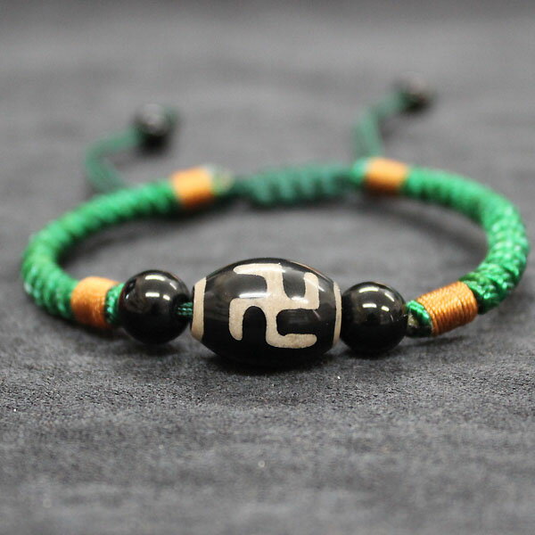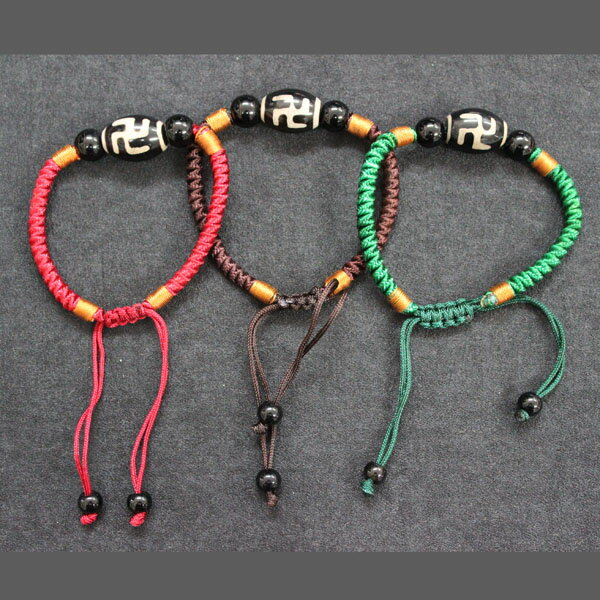 ★いまならネコポス便無料!★ まんじといえば思い出されるマークがこの卍です。この形には実は意味があって、輪廻を表すといわれています。また、縦の線、横の線は万物の繰り返される営みが表されているのです。 この萬字天珠は、くるくると生命が回り繁栄をもたらし財運をも上げるといわれています。 フリーサイズの天珠玉ブレスレット。 アジアンテイストなファッションにもよく合う 紐ブレスレットです。 ★天珠玉って?★ 古代チベットに伝わる聖なる守護石とされています。 石や骨などを円筒形に加工し、表面に模様を焼き付け、紐に通して身につけます。アクセサリーのようですが御守なのです。効果は焼きこまれている文様によって異なるようですが、皆を幸せに導く紋だといわれています。 ■商品詳細 天珠玉:萬字(まんじ) つやあり ブレスレットサイズ:約14〜22cm(フリーサイズ) プラスティック玉:黒8mmx2、6mmx2 ※水に濡らすと紐の色が落ちる恐れがあります。 お取り扱いにご注意ください。 チベット天珠/天珠玉/萬字/卍/まんじ/輪廻/フリーサイズ/ブレスレット/紐ブレスレット/御守/お守り/縁起物/ネコポス便無料
