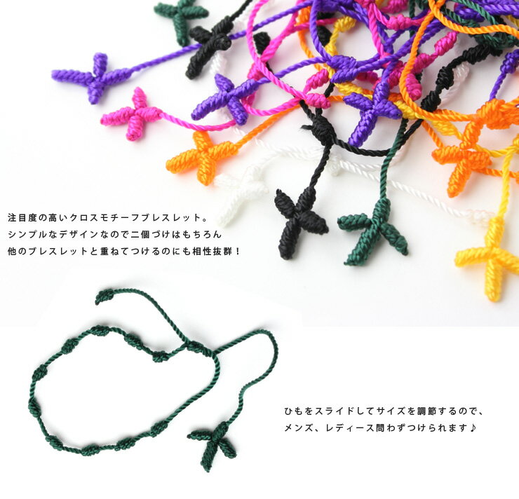 タイプ ブレスレット 腕輪 ナイロン 紐 シンプル ひも クロス 十字架 セレブ 海外 人気 メンズ レディース 夏 登山 アウトドア 2012 春 新作※ 商品写真は実際の色に近づけるように作業していますが、ディスプレイにより、実物とイメージ・色が異なる場合もございますので予めご了承下さい。 INFORMATION クロスモチーフハンドメイドブレスレットが届きました! ひもの先についたクロスモチーフがポイントの人気ブレスレット。 ひもをスライドしてサイズを調節する仕様なので、メンズ・レディースともにお使いいただけます♪ 二個づけはもちろん他のブレスレットと重ねづけにもぴったり。プチプラなお値段なので手軽に買えるのもうれしい。 spec サイズ(フリー) 外径:約24cm(サイズ調節可能) 素材 ナイロン 生産国 韓国