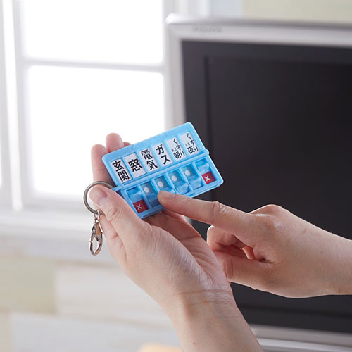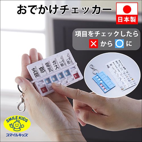 外出先でも確認ができて安心特長■特徴・キーフォルダー付。2つ折りでコンパクトになり、バッグやランドセルに付けることができて持ち運びの邪魔にならない。・お年寄用とお子様用の項目シール付属。また、無地のシールにはお客様のオリジナルな項目記入可能。■商品説明・お年寄の外出時に鍵の施錠、電気の消灯、薬の服薬などの確認チェックをすることで、忘れてしまってもこの商品を見て確認し安心できる商品。・小さなお子様の忘れ物を防止する為のチェック商品仕様素材:本体/PS樹脂、キーホルダー:鉄商品サイズ:100×8×30mm開いたとき(キーホルダー含む)150×8×55mm商品質量:22g付属品:項目シール生産国:日本メーカー名:スマイルキッズ原産国:日本【代引きについて】こちらの商品は、代引きでの出荷は受け付けておりません。【送料について】北海道、沖縄、離島は送料を頂きます。