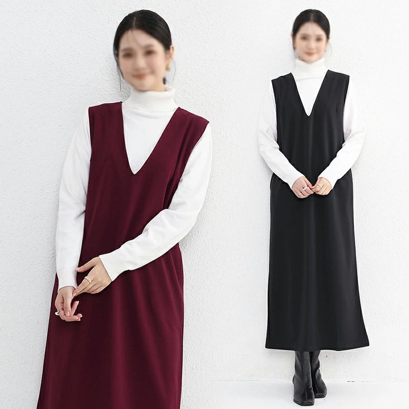 ファッション性と着心地を兼ね備えたモダンなサンドレス 深めのVネックで小顔効果もあり、デコルテラインを美しく見せます。重ね着の楽しさを際立たせるノースリーブデザインと、ゆったりとした滑らかなラインが特徴的な、カジュアルながらも洗練された印象を与える一枚です。落ち着いたカラーで、気分やシーンに合わせてお家着にもお出かけにも着回せるので、幅広くデイリーに使えるアイテムです。Vネックのカットと、サスペンダースカート、ベスト、スカートの程よく広がるAラインの優美なシルエットが一体となり、妊婦さんから大人の方まで着ていただける、飽きのこないデザインです。体型が気になる方にも嬉しい、サイドポケットも付いているので小物を入れるのにとても便利です。一枚で着るのはもちろん、タートルネックや長袖シャツとのレイヤードも可能で、シーズン問わず着用できるのも嬉しいポイントです。冬はニットやジャケットと合わせて暖かさを高め、春や秋には涼しげな素材のトップスと合わせて快適に過ごせます。季節問わず活躍し、長く愛用していただけるアイテムですので、季節に合わせたファッションをお楽しみください。モノトーンのストライプシャツと合わせればモダンな雰囲気に、シンプルな白シャツと合わせればきれいめな印象に、忙しい毎日を過ごす女性にぴったりのカジュアルスカートワンピースです。スタイルはブーツでカジュアルダウンしたり、パンプスで上品な雰囲気を演出したり、様々なスタイルに合わせられます。サイズは平置きで計測しており、若干の誤差が生じる場合がございます。また、モニターや部屋の照明等の違いにより、実際の商品と色味が異なる場合がございます。