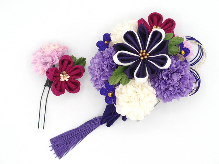【コーム飾り】縦 約12cm 横 約11cm 【Uピン飾り】縦 約5cm 横 約6cm ※Uピン・房は長さに含まれません ◆材質 造花 ちりめん コーム Uピン ◆詳細 新品 手作り 房 つまみ細工 2点セット ◆色 シックな紫 薄紫 白 金 ◆ご利用シーン 成人式 入学式 卒業式などの フォーマルからカジュアルなお着物に ◆商品説明 パッと目を引くオシャレな髪飾り。 紫色好きにはたまらない大満足の一品です。 人気のつまみ細工のお花やピンポンマムが飾られています。 コーム髪飾りには、藤下がりと房がついていて、 ゆらゆらと華やかさをプラスしてくれます。 2点セットですので、着物に合わせ自由な組み合わせでご使用いただけます。 ヘアスタイルによっても使い分け出来ますので、重宝すること間違いなし。 成人式の振袖はもちろん、浴衣や袴などに合わせたり、 親子で一つずつ付けて親子リンクコーデにしたりしてもオシャレ。 思い出に残る素敵な1日を^^【おすすめ商品】 お色違い髪飾り 卒業式のリボン 浴衣髪飾り 大きい髪飾り