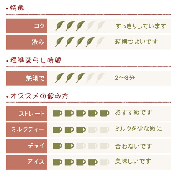 名称 紅茶 原材料 紅茶 原産国 スリランカ 内容量 500g 賞味期限 製造日より2年(商品ラベルに記載) 保存方法 高温多湿をさけて保存してください。 製造者または販売者 株式会社セレクティー 静岡県静岡市葵区葵町49スリランカ南西部、中央山岳地帯に広がる紅茶産地の西側斜面の高地で作られるディンブラ紅茶は ウバ、ヌワラエリヤと並ぶセイロン紅茶を代表するハイグロウンティー(高地栽培茶)の 一つです。 産地の西側に位置するディンブラ紅茶の産地は毎年2月〜3月になるとモンスーンによるインド洋からの季節風の影響で、からっと晴れる日が多く、朝夕の寒暖の差が多くなって一番高い品質の紅茶が作られるクオリティーシーズンとなります。 (最近は天候不順により4月頃まで遅れることが多いようです) 明るく鮮やかな紅色の水色(すいしょく)、バラの花にもたとえられる華やかな香りは、セイロン紅茶の代表格としてウバ紅茶やヌワラエリヤ紅茶と共に知られています。 ディンブラ紅茶自体は高地栽培茶ですが、高地はヌワラエリヤ、低地はキャンディーに接するために、茶園やシーズンによって液色も濃い目で赤色のまったりとコクのあるタイプから、より高地栽培茶の特徴をもったドライで渋みが強い紅茶まで幅広い種類の紅茶が見かけられます。 クオリティーシーズンのディンブラ紅茶は香りを引き出すために発酵は抑えぎみに作られ、そのため液色は明るく、ドライであおっぽく、渋みも強いのが特徴です。 クオリティ-シーズンのディンブラ・デスフォード茶園です。 若葉のような爽やかな香りに、明るい鮮やかな水色(すいしょく)で、気分も明るくなります。目が覚めるような渋みの中に、ほのかな甘みも感じます。 冷めてくると、渋みが落ち着き、少しマイルドな味わいになります。 ストレートティーで渋すぎるときは、茶葉の量を減らしたり、蒸し時間を短くするなどの加減をされると良いでしょう。 原材料:紅茶 茶葉原産国:スリランカ 茶葉の種類:BOP 水色:透き通った明るい紅色 茶葉の量:ティースプーン 平盛1杯(約2グラム)
