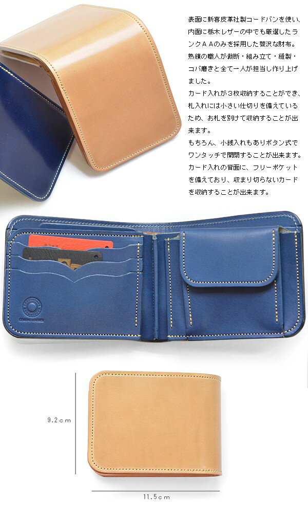 表面に新喜皮革社製コードバンを使い、内面に栃木レザーの中でも厳選したランクAAのみを採用した贅沢な財布です。 熟練の職人が裁断・組み立て・縫製・コバ磨きと全て一人が担当し作り上げました。 カード入れが3枚収納することができ、札入れには小さい仕切りを備えているため、お札を別けて収納することが出来ます。もちろん、小銭入れもありボタン式でワンタッチで開閉することが出来ます。 カード入れの背面に、フリーポケットを備えており、収まり切らないカードを収納することが出来ます。 また、プレゼントや自分へのご褒美、今まで革財布を持ったこと無い方に、ぜひ持っていただきたい当店イチオシの財布です。 ■ブランド:CROSS ROADS ■品名:スウィング ショートウォレット コードバン タイプA ■素材 ・表面:コードバン(新喜皮革) ・内面:栃木レザー(牛革 AAランク) ■外寸サイズ:H9.2×W11.5×D3.5cm ■収納 ・札入れ×1 ・小銭入れ×1 ・カード入れ×3 ・フリーポケット×1 ■カラー:タン・ネイビー・ブラック・ブラウン ■生産:HANDMADE in JAPAN (日本製) メンズ レディース 肌触り 傷に強い 柔らかい 可愛い かわいい 大人かわいい 大人女子 大人かっこいい かっこいい 大人っぽ SNS SNS映え インスタ インスタ映え インタグラム ニュアンス ニュアンスカラー レトロ カラーバリエーション カラバリ おしゃれ オシャレ オススメ おすすめ オリジナル コンパクト ブランド レザー 革 革製品 革小物 皮 本皮 牛革 牛皮 牛本革 牛本皮 革職人 職人技 高機能 実用的 便利 機能美 収納力 丈夫 頑丈 デザイン性 デザイン 上質 上質素材 本物志向 高級感 高品質 上品 エレガント カラー シンプル ビジネス ファッション カジュアル スーツ 洋服 コーディネート 流行 トレンド 人気 ランキング 送料無料 春 夏 秋 冬 春財布 夏財布 秋財布 冬財布 ブランド クロスロード CROSS ROADS 日本製 国産 ハンドメイド 手作り 熟練 メイドイン大阪 栃木レザー トチギレザー サイド7 最上級 最高 高級レザー グレード 新品 未使用 ▼シーン ギフト プレゼント レジャー 記念日 記念品 御祝い 合格祝い 仕事 就活 就職 就職祝い 就職準備 新生活 新生活応援 新生活準備 成人式お祝い 贈り物 卒業 卒業記念品 卒業祝い 退職祝い 大明日 誕生日 誕生日プレゼント 通学 通勤 転勤 入学 入学式 入学祝い 入社 入社式 父の日 父の日ギフト 父の日プレゼント 母の日 巳の日 旅行 12月 アウトドア いい夫婦の日 お祝い お買い物マラソン マラソンセール 感謝祭 ブラックフライデー 買いまわり お返し お礼 クリスマス クリスマスプレゼント クリスマスプレゼント父の日ギフト スーパーセール バレンタイン ビジネス 一粒万倍日 開運 歓迎会 還暦祝い 吉日 金運 敬老の日 結婚記念日 ▼対象 10代 20代 30代 40代 50代 60代 70代 カジュアル サラリーマン ビジネスパーソン ペア お揃い メンズ 男性 男性向け 男性用 ユニセックス ジェンダーレス 男女兼用 レディース 女性 女性向け 女性用 学生 還暦 高校生 社会人 新社会人 成人 大学生 大人 彼氏 彼女 妻 旦那 息子 娘