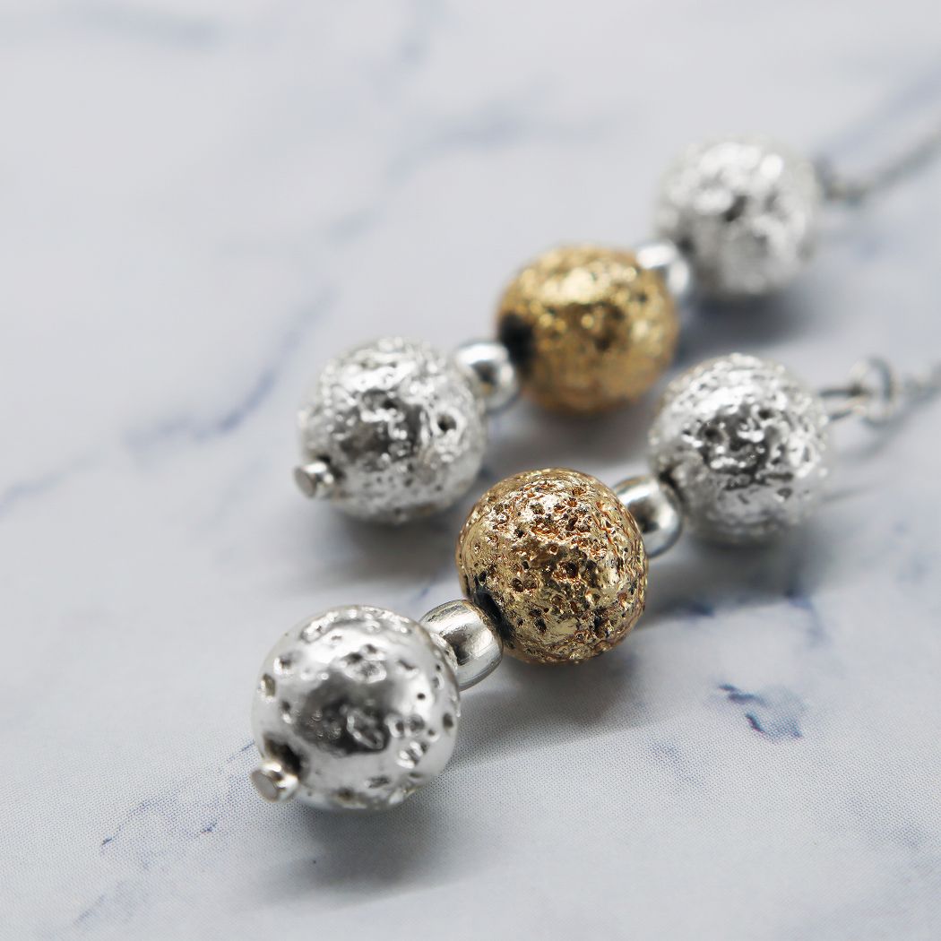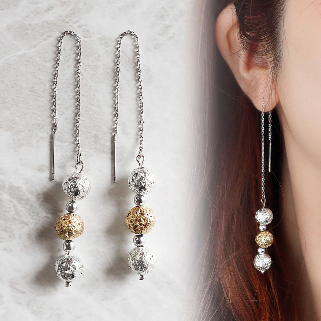 ★高品質ジュエリー袋付!プレゼントにもお勧めです★ ラバストーンを使用したアメリカンピアスです。 シルバー・ゴールドのカラーが 耳元でゆらゆらと揺れてアクセントに。 馴染みやすいカラーでもあるので、日常使いにピッタリです♪ ラバストーンとは… 火山から流れ出した溶岩が固まってできたパワーストーン。 石が冷えて固まる際に出来た表面の凹凸が特徴です。 特に対人関係を良好にする効果があるといわれており、 友人・恋人・夫婦間の絆を深めたい方にもオススメです♪ 【ブランド】 UNI STONE 【素材】 ポスト・チェーン:サージカルステンレス ストーン:溶岩石(ラバストーン) 他パーツ:合金 【サイズ】 全長 :13cm ストーン:8.5mm 丸玉 :4mm ポスト+チェーン:9cm 【価格】 1980円/両耳 ジュエリー袋付き ※ラッピング(ジュエリーボックス・紙袋)は別途800円で承ります。 ご希望の方はお知らせください。 (リボンはベージュ・ブラックのどちらかランダムとなります。) ・モニター環境や製造時期により、多少色味が異なる場合がございます。 ・天然石を使用している為、色・サイズに若干のバラつきがございます。