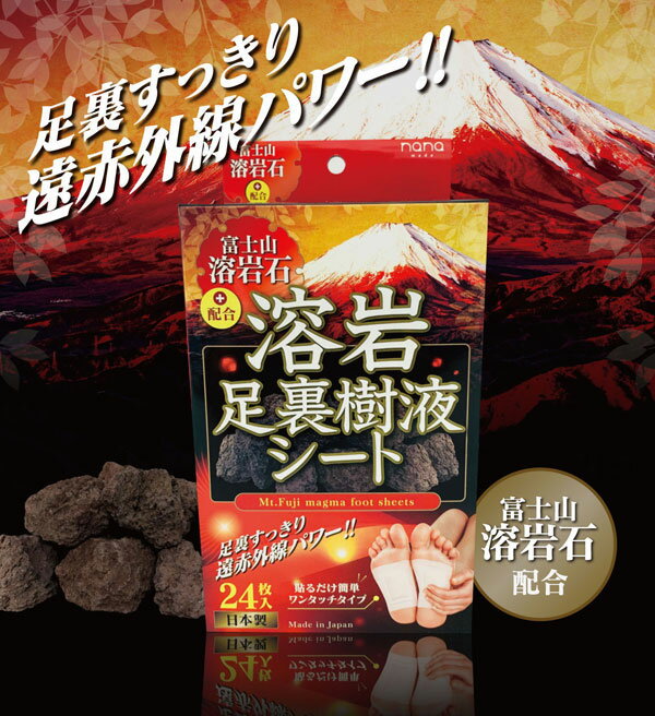 注 意 事 項 ※記載の商品サイズは、おおよその目安です。表示サイズと若干の違いがあることがあります。 ※ぶつけたり落とした場合、破損する場合がございますのでご注意下さい。 ※商品の画像はできるだけ正確性を期しておりますが、ご覧のブラウザ・PC等の環境で実際の商品と若干異なる場合がございます。予めご了承ください。 配 送 方 法 こちらの商品は【宅配便】での発送となります。 【メール便】はご利用いただけません。富士山溶岩石足裏樹液シート24枚入り 足裏は全身のツボが集まっている場所です。 「足裏樹液シート」はシートに含まれる樹液粉末が足裏の水分を吸い込み、 また富士山溶岩石とゲルマニウム・トルマリンパワーで 足の裏からリフレッシュします。 【富士山溶岩石パウダー含有】 ミネラルの塊である富士山溶岩石は、人体に必要なミネラルが豊富に含まれています。遠赤外線、マイナスイオンの放射にも優れています。 【有機ゲルマニウム・トルマリン】 ゲルマニウムは半導物質で、身体と接触する温度が32℃を超えるとマイナス電子を放出。体内の電位バランスを整えるといわれています。また摩擦によりマイナスイオンの発生を促します。 【天然ヒノキチオール配合】 天然ヒノキチオールには殺菌作用のほかに優れた消炎作用があります。また浸透力が強く、細胞の新陳代謝を正常化する働きがあるため、強力な細胞賦活剤として認められています。 【貼るだけ簡単ワンタッチタイプ】 樹液シートと足裏シールが一体型なので貼るだけ簡単のワンタッチタイプです。