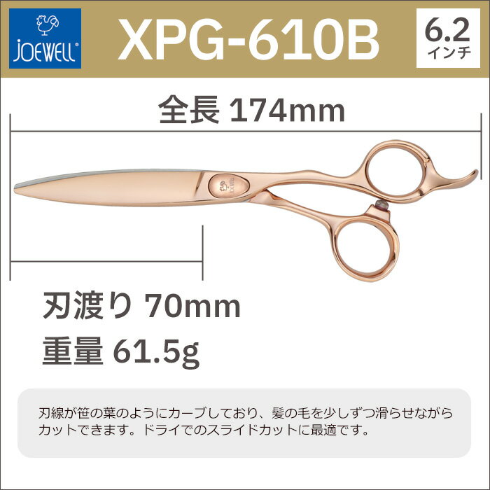 ★メーカー希望小売価格はメーカーサイトに基づいて掲載しています【JOEWELL】ジョーウェル ピンクゴールド XPG-610B 商品詳細 JOEWELL ドライカット・スライドカット用シザーズ ジョーウェル ピンクゴールド XPG-610B 刃線が笹の葉のようにカーブしており、髪の毛を少しずつ滑らせながらカットできます。 ドライでのスライドカットに最適です。 全長174mm / サイズ6.2インチ / 刃渡り70mm / 重量61.5g 笹刃 / ドライベアリングシステム 指穴調整リング白S付(両穴) ヒットポイント:ネジ式大クリア ピンクゴールドコーティング ※本製品は、表面にカラーコーティングを施しています。 使用の度合い等により、変色や色落ちする恐れがございます。 また、研ぎ・修理の内容によっても、色落ちする恐れがございます。 あらかじめご了承いただきますようお願いいたします。 メーカー:株式会社東光舎 ※メーカー欠品の場合は納期が遅れる場合がございます。 保証:購入後1年間のメーカー保証 ※メーカーのユーザー登録を行うと、無料修理サービスが受けられます。詳しくはメーカーのホームページをご覧ください。