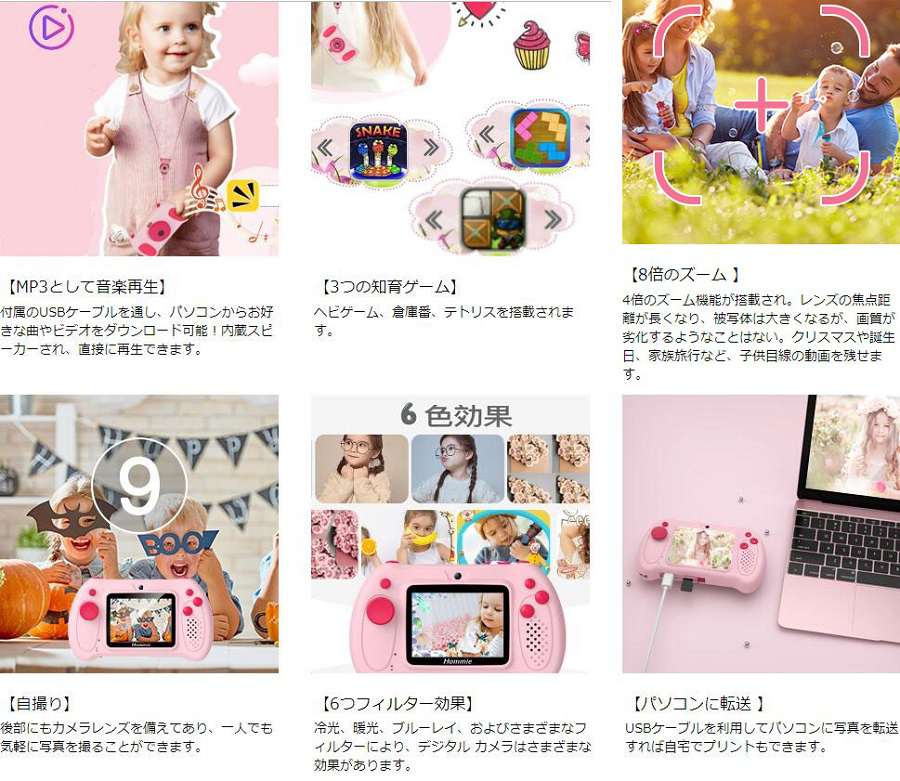 商品説明 商品情報 【2.4インチIPS大画面&4000万高画素】 ?2.4インチIPS液晶ディスプレイで、精細なハイビジョン表示効果を実現する、2.0インチ画面より、この画面の大きさは子供の視力を保護するを果たす。?4000万高画素、48MP&1080P解像度が搭載されるなのて、鮮明な写真や動画を撮れる。 【 デュアルレンズ付き&自撮り可能 】 ?フラッシュを活用することで、環境光が少ない場所でも、キレイに撮影できる。レンズから見える世界を大人が想像する以上に楽しみる。?前後カメラで自撮りが楽にできる!片手でも持ちやすい。?8倍ズーム付きで、被写体を自由に拡大・縮小できる。?28種フレーム、6種フィルター、タイマー撮影やオートフォーカス、露出補正機能を搭載され、いろいろな楽しみ方ができる 【MP3音楽再生&耐用性】 ?内蔵スピーカーが搭載され、MP3プレイヤーとして音楽再生をサポートする子ども用トイカメラ!。(注:Micro SDカードを挿入する時のみMP3機能を利用可能)?安全のABS材料を採用して、手触りが良くて子供に有害な物などを含みていない。万が一落としてしまっても壊れるかが心配なく 【子供のクリスマスや新年のプレゼントとして最高】 幼稚園、小学生になると、友達と遊ぶことが増えて、遠足や修学旅行の時などで外に出るタイミングも増える為、お子様へのクリスマスプレゼント、誕生日プレゼント、新年ギフトとして最適なプレゼントです。子供の成長に伴ういいパートナとなります 保証期間 180日間保証 ご使用中においてのお客様の過失による故障、破損、改造等はサポート保証の対象外となります。 注意事項 ●運送事故により箱が潰れる可能性がございます。 ●入荷状況により予告なし、デザイン性若干変更する場合がございます。ご了承くださいませ。 メーカー希望小売価格はメーカーサイトに基づいて掲載しています