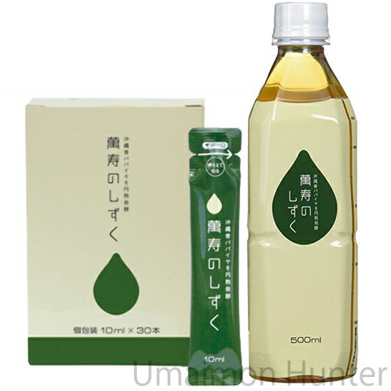 【名称】 清涼飲料水 【内容量】 500ml(10本入)×1ケース+フレッシュパック(10ml×30本入り)×5箱セット 【賞味期限】 500ml:製造日より540日 フレッシュパック:製造日より365日 ※開封後は冷蔵庫に保存してお早めにお召し上がり下さい。 【原材料】 玄米、米ぬか、青パパイヤ、こんぶ、もずく 【保存方法】 直射日光・高温多湿を避けて保存 ※開封後は要冷蔵(10℃以下) 【お召上がり方】 1日に10ml〜30mlを目安にご利用ください。 お水、お茶、コーヒー、ジュースなどに入れてお召し上がり下さい。 【販売者】 株式会社オリーブガーデン(沖縄県国頭郡恩納村) メーカー名 株式会社熱帯資源植物研究所 原産国名 日本 産地直送 沖縄県 商品説明 『萬寿のしずく』は、沖縄で古くから食されてきた“長寿食材”を厳選して作られた健康飲料です。 自社農場で育てた有機栽培の青パパイヤをはじめ、玄米、米ぬか、こんぶ、もずくの5つの食物原料を、有用微生物群(EM)を使った独自の技術で発酵・熟成し抽出された健康エキス。 発酵飲料なのに水のように無味無臭に近く、お子様からご年配の方まで皆さまの健康づくりにお役立ていただけます。 毎日少量を飲むことで健康生活をサポートします。 『萬寿のしずく』は琥珀色の健康エキス。 この琥珀色こそメラノイジンの一種、 PAC(パック)と呼ばれる健康成分です。 抗酸化作用、食物繊維類似作用があるとされています。 このPACの働きを解明するため臨床試験を行ったところ、糖尿病および脂質異常症の患者さんで 尿中の酸化ストレス指標が減少傾向を示しました。 PACの継続摂取が患者さんの効酸化能を高め、好影響をもたらすことが示唆されました。 ミネラルは心と身体の健康を保つ大切な栄養素です。 『萬寿のしずく』には自然由来の多種多様な微量ミネラルが含まれています。 食生活だけでは摂取が難しいミネラルを毎日少しずつ補い、健康な毎日をサポートします。 沖縄ではオレンジ色に熟す前の青いパパイヤを野菜として食し、昔から長寿食材「万寿瓜(マンジューイ)」と いわれ人々に親しまれてきました。 『萬寿のしずく』は自社農場で大切に栽培したこの青パパイヤをはじめ、 北陸産有機JAS認定の玄米・米ぬか、北海道産こんぶ、沖縄産もずく、すべて国産の厳選された素材を使用しています。 『萬寿のしずく』の原料はこの5つの素材と水だけ。 保存料など添加物は一切加えていません。 すべて自然・植物由来の健康エキスです。 『萬寿のしずく』はほとんど無味無臭。 一日の飲料も10〜30mlと少量です。 そのままではもちろん、 お茶やジュースなど、お好みの飲み物に入れても味を邪魔しません。 また加熱しても栄養成分に変化がありませんので、炊飯やお料理の際に加えていただくこともできます。宅急便:常温着日指定:〇可能 ギフト:×不可 ※生産者より産地直送のため、他商品と同梱できません。※納品書・領収書は同梱できません。 領収書発行は注文履歴ページから行えます。 こちらの商品は一部地域が配送不可となります。 配送不可 離島 ※「配送不可」地域へのご注文はキャンセルとなります。