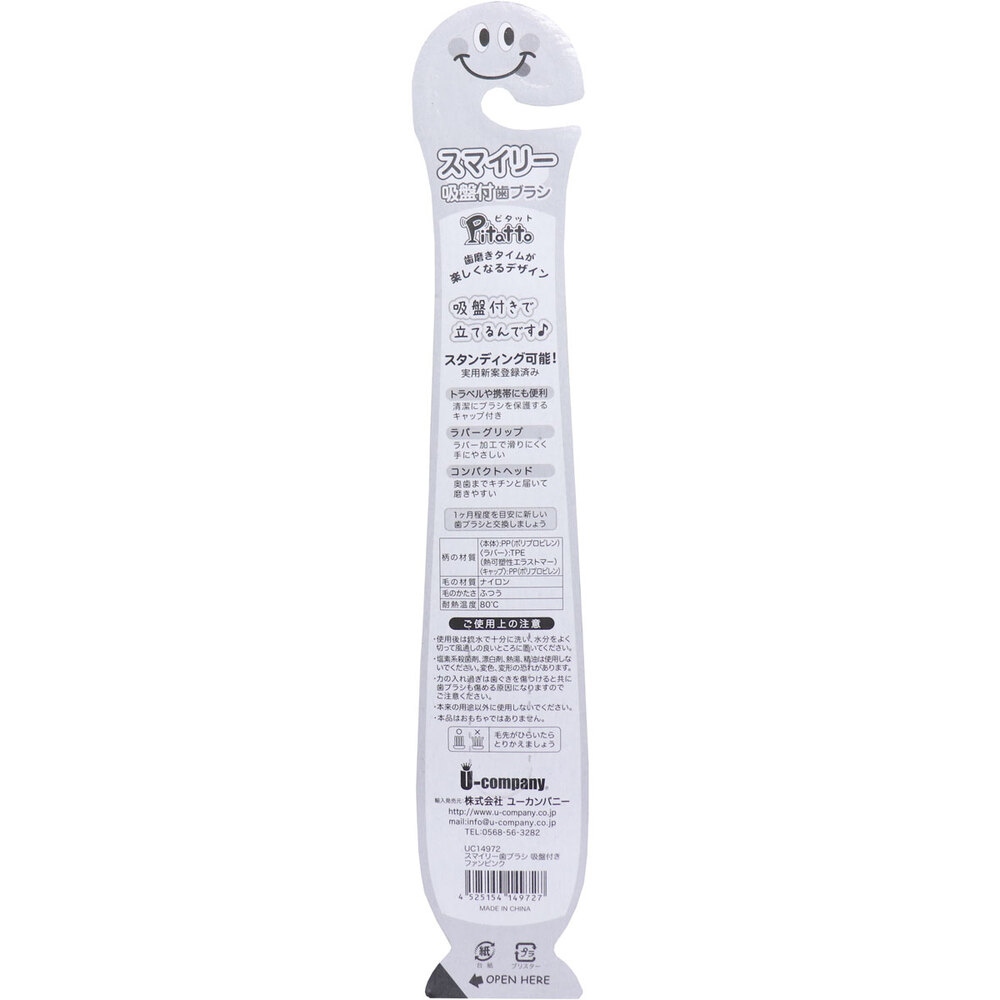 歯磨きタイムが楽しくなるデザイン♪ 2本の足に付いた吸盤がくっついて立つ衛生的で可愛い笑顔の歯ブラシです。 ●かわいいデザインなのでお子様や女性へオススメの歯ブラシです。 ●便利なキャップ付き。 ●くっついて倒れないので、洗面台の場所をとりません。 ●ラバー加工で滑りにくく手にやさしいハンドル。 ●奥歯までキチンと届いて磨きやすいコンパクトヘッド。 ●色:ファンピンク。 ※ご協力のお願い! 推奨価格がある商品です。 価格のご確認をお願い致します。 推奨価格での販売のご協力をお願い致します。 推奨180円(税抜) 【柄の材質】 本体・・・PP(ポリプロピレン) ラバー・・・TPE(熱可塑性エラストマー) キャップ・・・PP(ポリプロピレン) 【毛の材質】 ナイロン 【毛のかたさ】 ふつう 【耐熱温度】 80度 【ご使用上の注意】 ・1ヶ月程度を目安に新しい歯ブラシと交換しましょう。 ・毛先がひらいたらとりかえましょう。 ・使用後は流水で十分に洗い、水分をよく切って風通しの良いところに置いてください。 ・塩素系殺菌剤、漂白剤、熱湯、精油は使用しないでください。変色、変形の恐れがあります。 ・力の入れ過ぎは歯ぐきを傷つけると共に歯ブラシも傷める原因になりますのでご注意ください。 ・本来の用途以外に使用しないでください。 ・本品はおもちゃではありません。歯磨きタイムが楽しくなるデザイン♪ 2本の足に付いた吸盤がくっついて立つ衛生的で可愛い笑顔の歯ブラシです。 ●かわいいデザインなのでお子様や女性へオススメの歯ブラシです。 ●便利なキャップ付き。 ●くっついて倒れないので、洗面台の場所をとりません。 ●ラバー加工で滑りにくく手にやさしいハンドル。 ●奥歯までキチンと届いて磨きやすいコンパクトヘッド。 ●色:ファンピンク。 ※ご協力のお願い! 推奨価格がある商品です。 価格のご確認をお願い致します。 推奨価格での販売のご協力をお願い致します。 推奨180円(税抜) 【柄の材質】 本体・・・PP(ポリプロピレン) ラバー・・・TPE(熱可塑性エラストマー) キャップ・・・PP(ポリプロピレン) 【毛の材質】 ナイロン 【毛のかたさ】 ふつう 【耐熱温度】 80度 【ご使用上の注意】 ・1ヶ月程度を目安に新しい歯ブラシと交換しましょう。 ・毛先がひらいたらとりかえましょう。 ・使用後は流水で十分に洗い、水分をよく切って風通しの良いところに置いてください。 ・塩素系殺菌剤、漂白剤、熱湯、精油は使用しないでください。変色、変形の恐れがあります。 ・力の入れ過ぎは歯ぐきを傷つけると共に歯ブラシも傷める原因になりますのでご注意ください。 ・本来の用途以外に使用しないでください。 ・本品はおもちゃではありません。