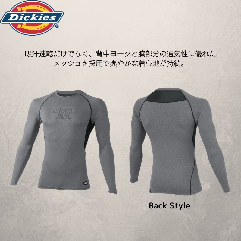 商品情報素材/材質DRYパワーストレッチポリエステル90%・ポリウレタン10%メッシュ部分:ポリエステル87%・ポリウレタン13%サイズ/寸法M 胸囲 84 裄丈 76 着丈 64L 胸囲 88 裄丈 78 着丈 65LL 胸囲 92 裄丈 80 着丈 663L 胸囲 98 裄丈 82 着丈 674L 胸囲 104 裄丈 82 着丈 68その他商品説明吸汗速乾だけでなく、背中ヨークと脇部分の通気性に優れたメッシュを採用で爽やかな着心地が持続。注意このページの製品は海外生地、海外染色のため、製品により若干の色違いが発生することがございます。ご了承ください。染料が色落ちしますので他の物と一緒に洗わないでください。汗や雨など湿った状態および摩擦によって色移りすることがあります。洗濯により3%前後縮みますので丈詰めをする際には股下を長めにしてください。乾燥機の使用はお避けください。素材の特性上、生地性能の低下を招く可能性がありますので、タンブル乾燥機のご使用はお避けください。熱やスチームで縮むことがありますので、アイロン掛けには十分注意してください。Dickies ディッキーズ D-2098 ドライ パワーサポート 長袖 インナー アンダーシャツ インナーシャツ ストレッチ 吸汗速乾 消臭 メンズ 作業着 作業服 春夏 秋冬 アウトドア スポーツ 仕事着 ワークウェア ランニング コンプレッション Dickiesブラック モクグレー 2色展開 吸汗速乾だけでなく、背中ヨークと脇部分の通気性に優れたメッシュを採用で爽やかな着心地が持続。 5