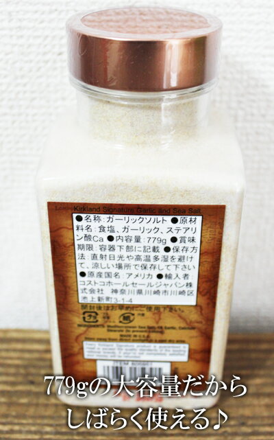 ※レビューは必ず商品到着後にお書きください。 【商品名】 【KIRKLAND】GARLIC SALT ガーリックソルト/コストコ 【商品説明】 ■どんな料理にもよく合う、ガーリックソルトです ■揚げ物、炒めもの等あらゆるお料理の味付けに。 【内容量】 779g