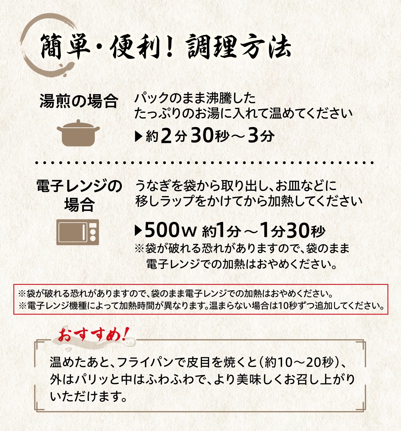 | 保存方法 | 【うなぎ蒲焼】10℃以下で保存してください 【蒲焼のタレ】10℃以下で保存してください 【山椒】湿気を避け冷暗所で保存してください |