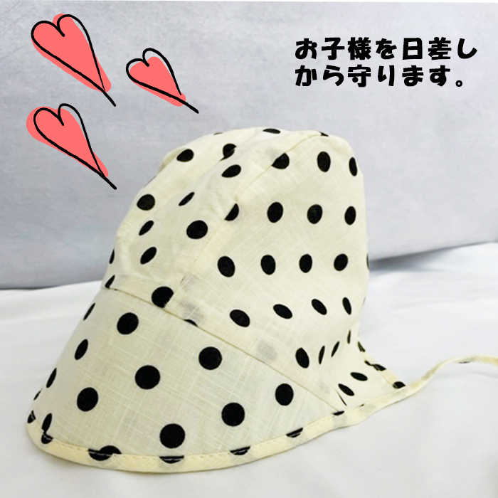 | 商品説明 | ベビー・キッズ帽子です。 日差し対策にお使い頂けます。 通気性の良い素材で快適です。 あご紐が付いているので落としてしまう事もありません。出産祝いやギフト等にもおすすめです。 |