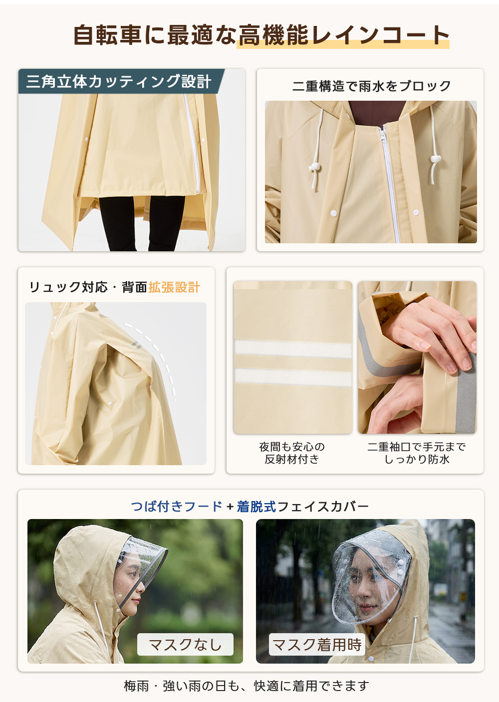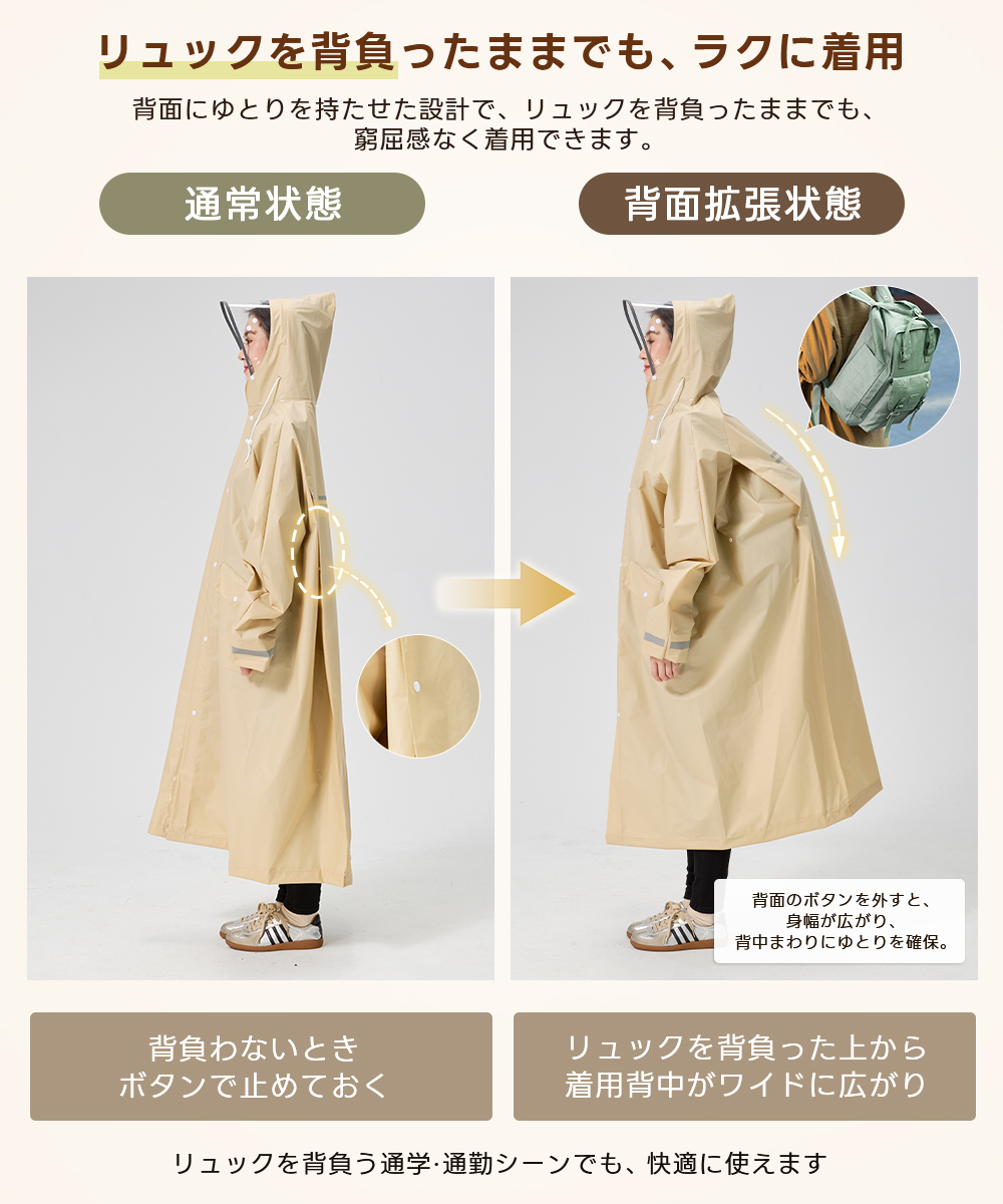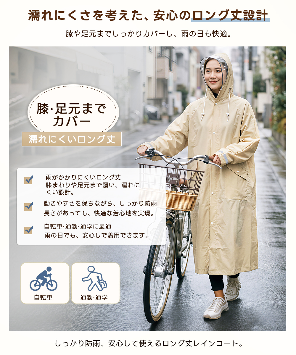 レインコート 自転車 レディース リュック対応 レインポンチョ ロング丈 おしゃれ 完全防水 撥水 軽量 カッパ 雨具 バイク 通学 通勤 中学生 高校生 ママチャリ 送り迎え 防災 梅雨 台? 反射板 二重袖口 M L XL 男女兼用 メンズ 大きいサイズ 2026改良版 返品保証 180日保証