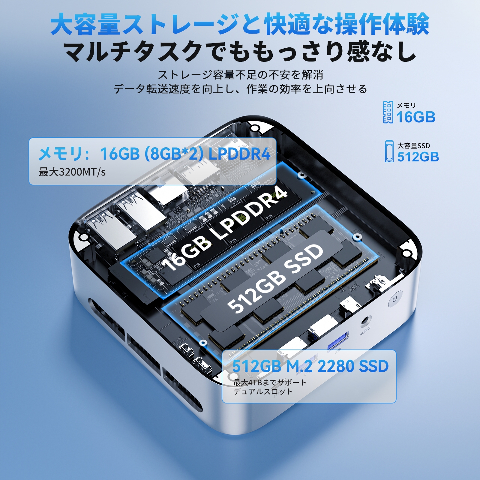 | 内蔵ストレッジ | 容量:SSD:512GB 規格:M.2 2280 SSD, 最大 4TBまで |
