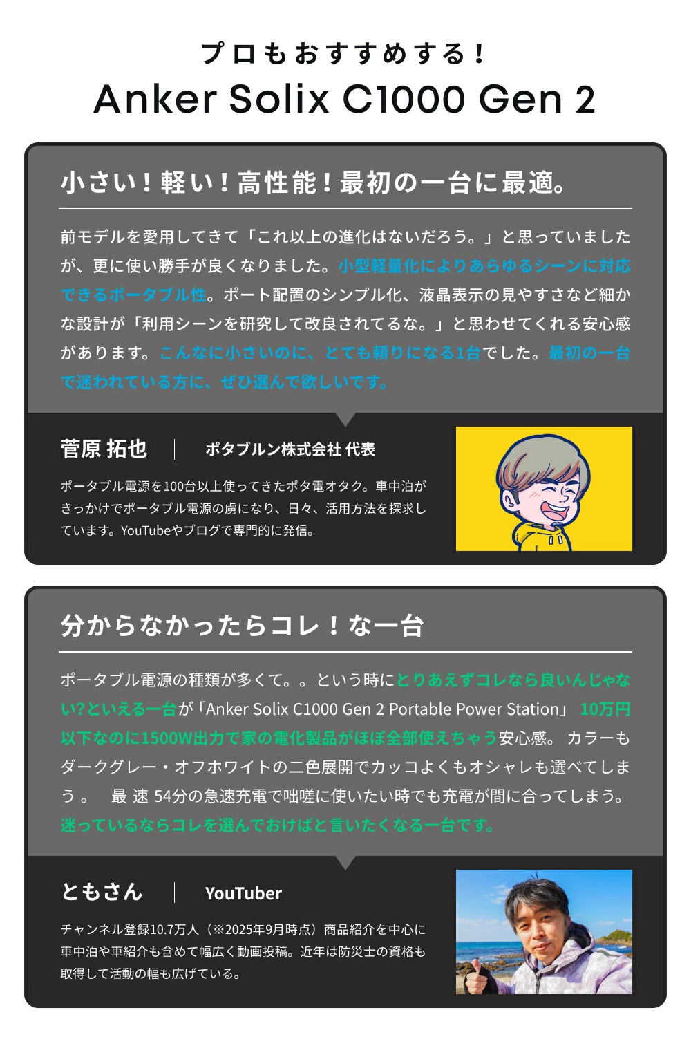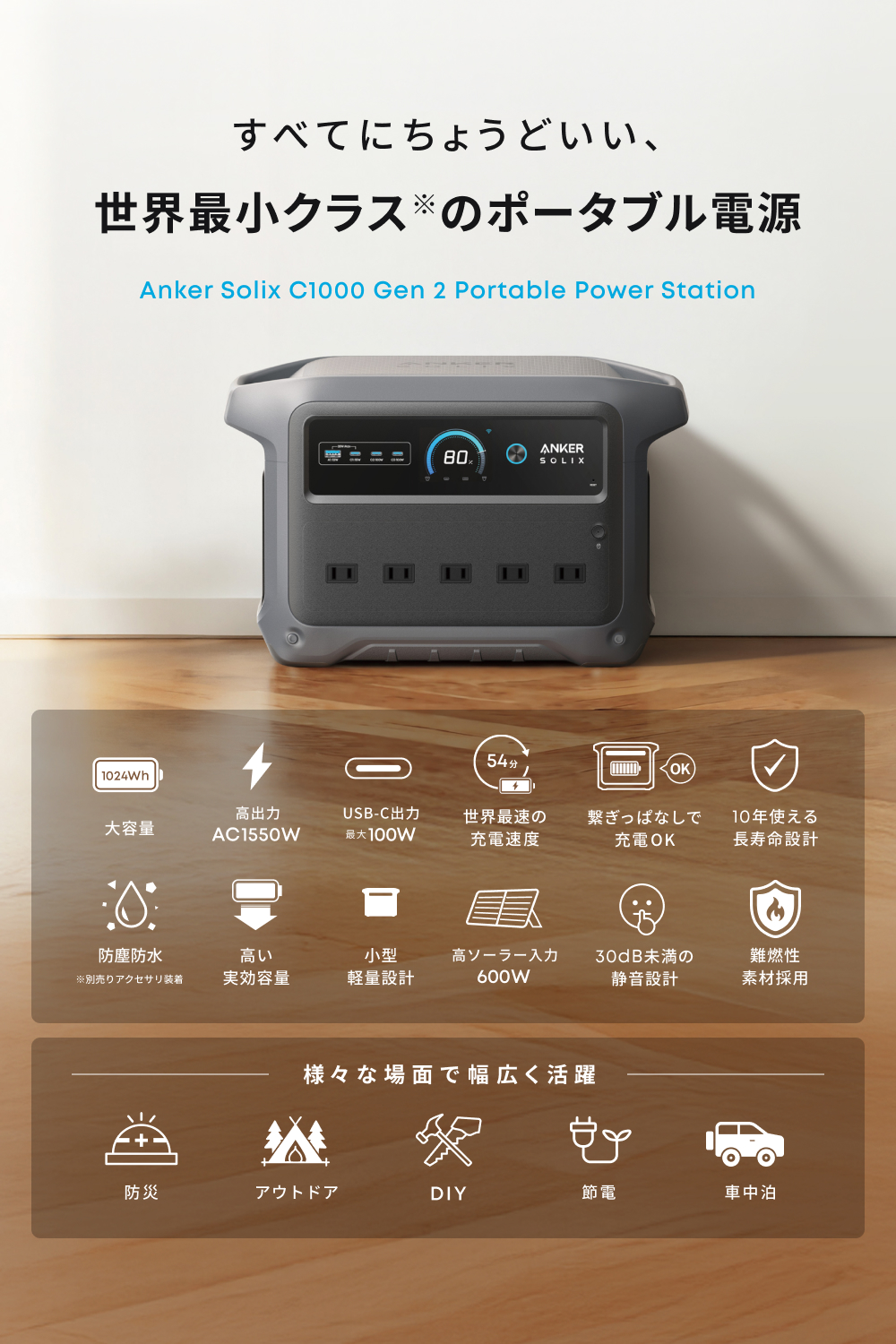 | パッケージ内容 | Anker Solix C1000 Gen2 Portable Power Station 製品本体、シガーソケット充電ケーブル、AC充電ケーブル、クイックスタートガイド、安全マニュアル Anker Solix PS100 Compact Portable Solar Panel 製品本体、MC4 & XT-60ケーブル (0.5m) 、MC4 & MC4延長ケーブル (3m) x2、安全マニュアル |