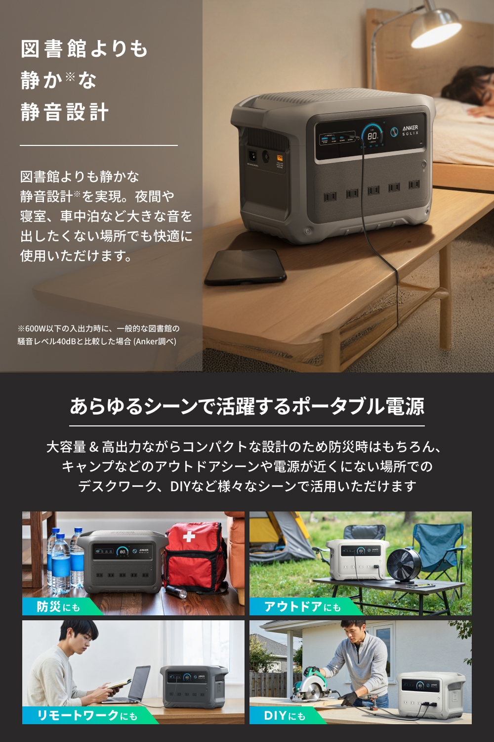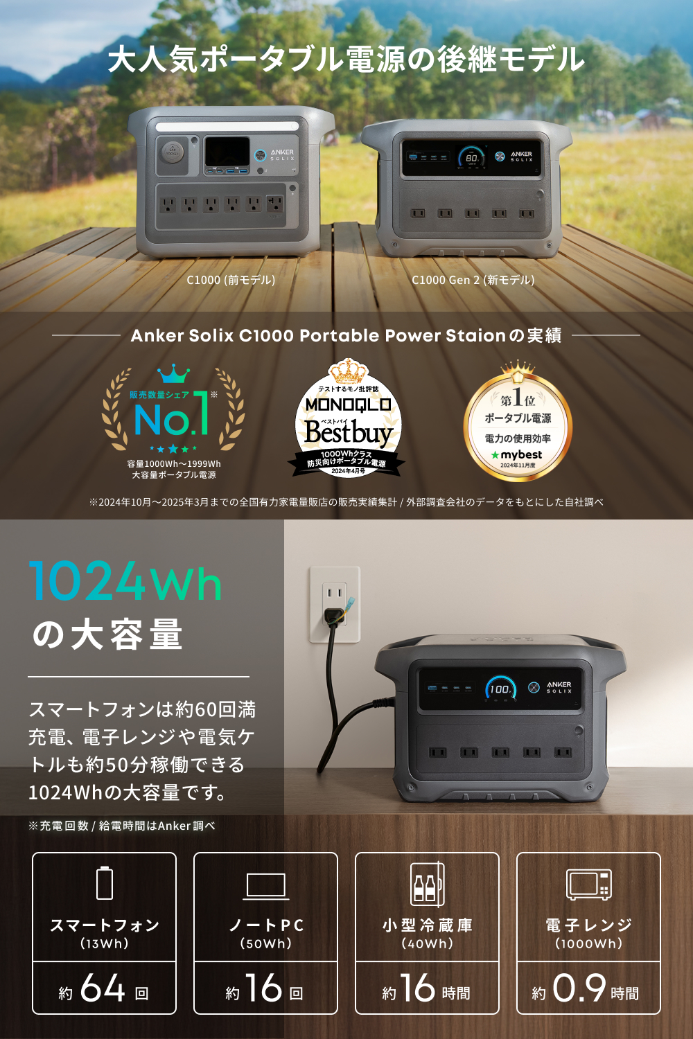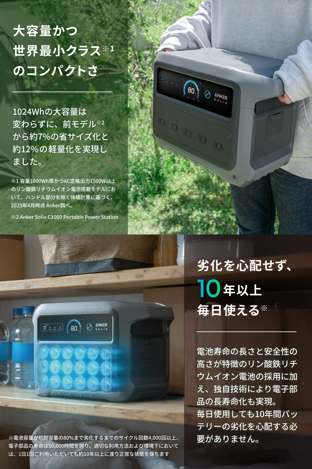 1000Wh以上の大容量は変わらずに、前モデル (Anker Solix C1000 Portable Power Station) から約7%の省サイズ化と約12%の軽量化を実現した世界最小クラスのポータブル電源です。※容量1000Wh帯かつAC定格出力1500W以上のリン酸鉄リチウムイオン電池搭載モデルにおいて。ハンドル部分を除く体積計算に基づく。 (2025年4月時点 Anker調べ)