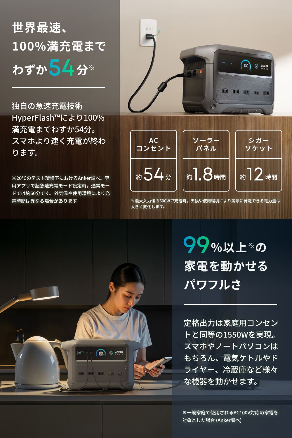 定格出力は家庭用コンセントと同等の1550Wを実現。スマホやノートパソコンはもちろん、電気ケトルやドライヤー、冷蔵庫など様々な機器を動かせます。