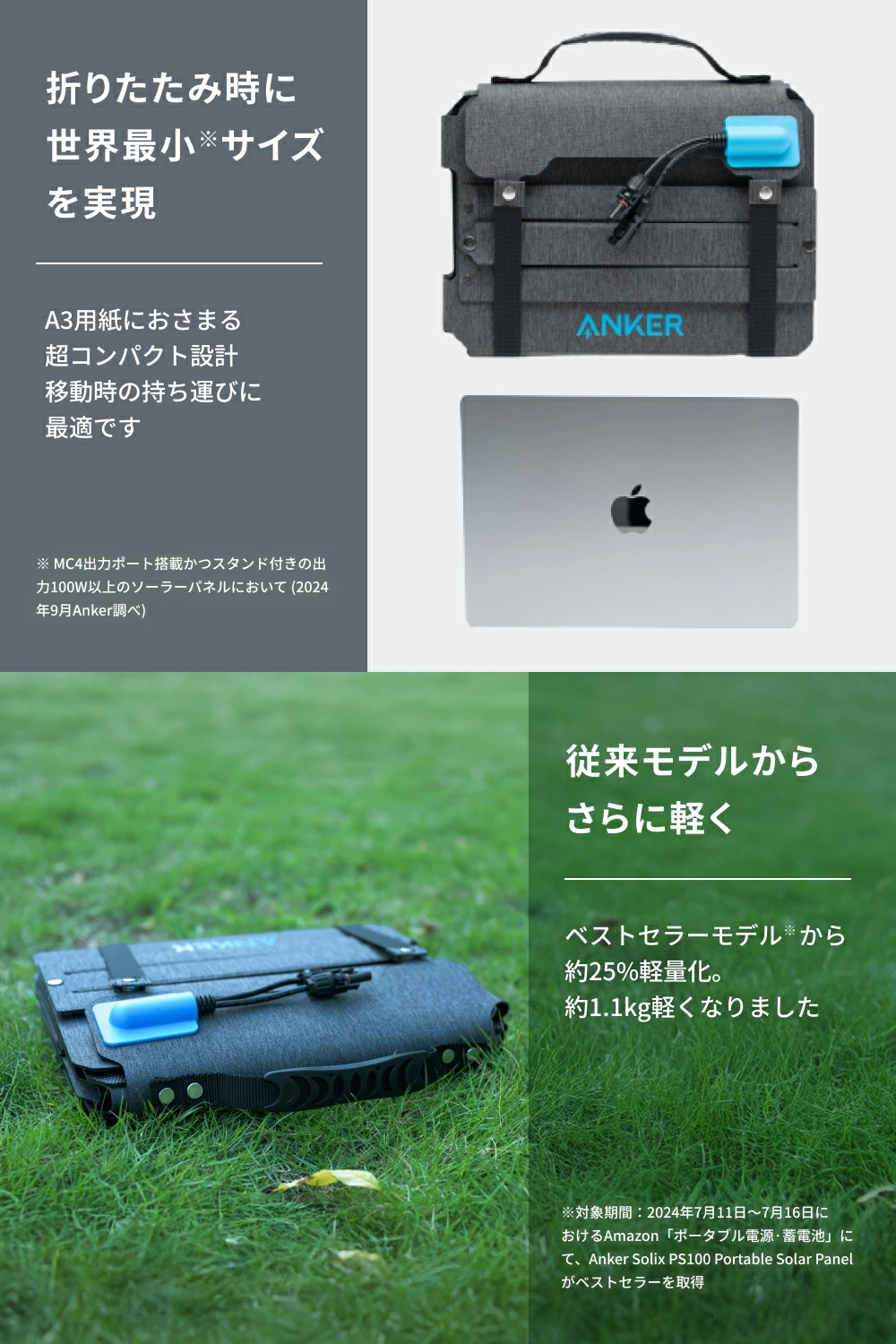 A3コピー用紙サイズに折りたたみ可能な100Wソーラーパネルです。「Anker Solix PS100 Portable Solar Panel」と同じ100W出力ながら、1/3以下の省サイズ化を実現しました。