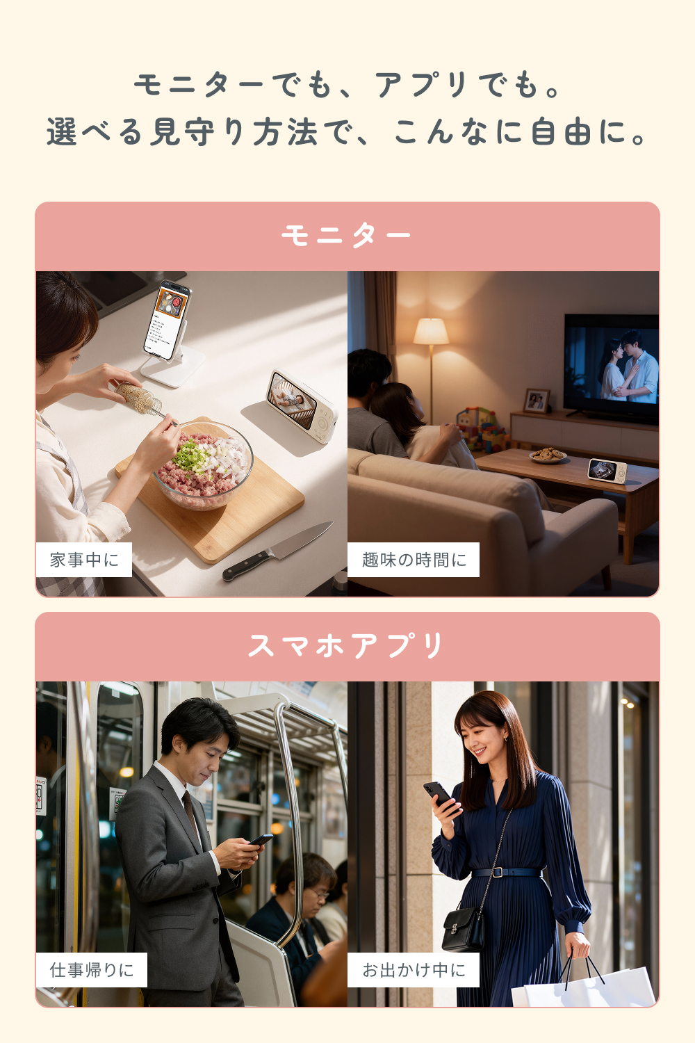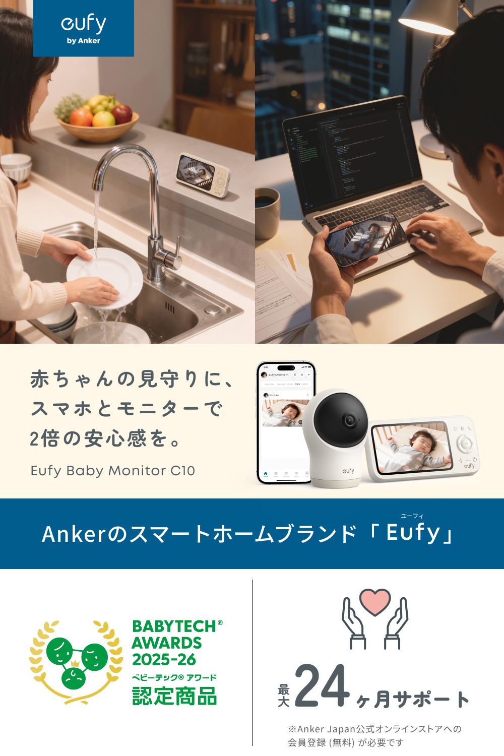 モニターとスマホアプリの両方に対応した2WAYの見守り方式を採用しています。家事中や趣味の時間には、スタンド一体型のモニターで常時見守り。仕事帰りやお出かけ中には、お手持ちのスマホアプリでいつでもどこからでも赤ちゃんの様子を確認できます。