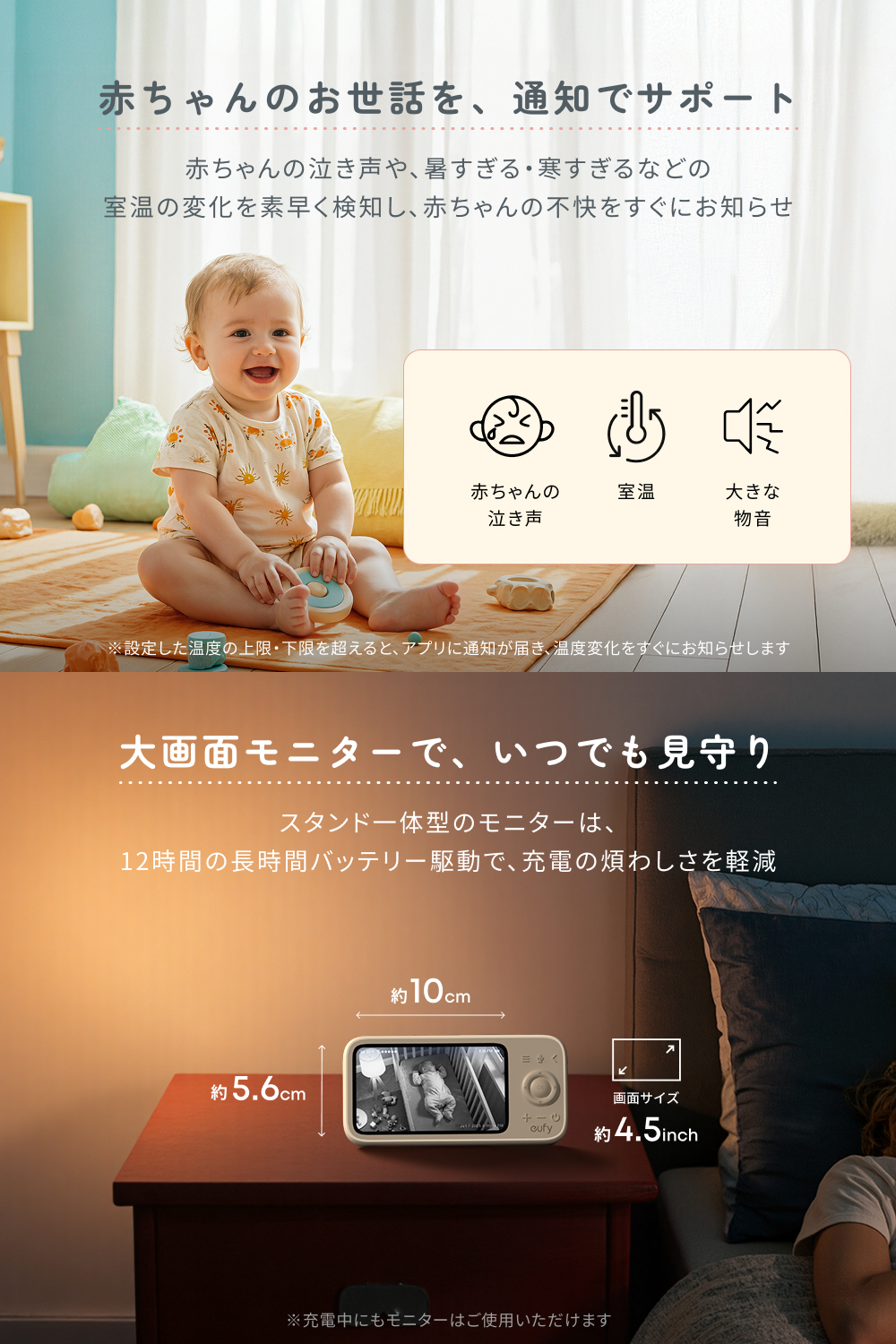赤ちゃんの泣き声や、暑すぎる・寒すぎるなどの室温の変化、大きな物音を素早く検知し、赤ちゃんの不快をすぐにお知らせします。また、スタンド一体型のモニターは、4.5インチの大画面。最大12時間の長時間バッテリー駆動で、充電の煩わしさを軽減し、いつでも快適に見守りが可能です。