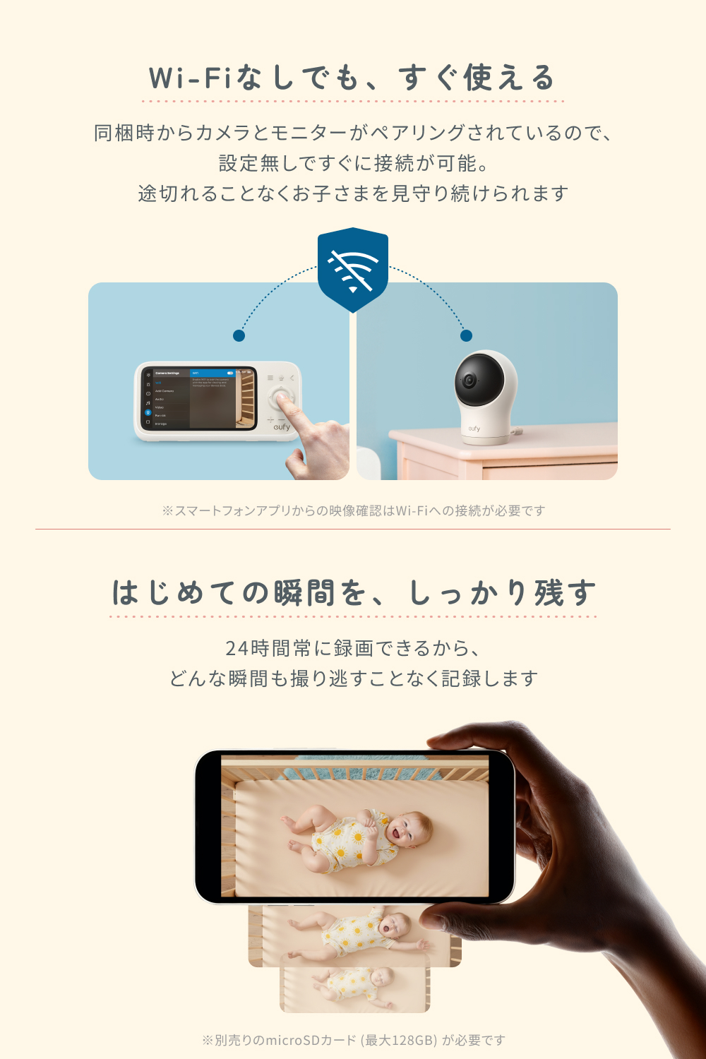 同梱時からカメラとモニターがペアリングされているため、設定なしですぐに接続可能。Wi-Fi接続がない環境でも途切れることなくお子様を見守り続けられます。また、別売りのmicroSDカード (最大128GB) があれば、24時間常時録画ができるので、どんな瞬間も撮り逃すことなくしっかり記録します。