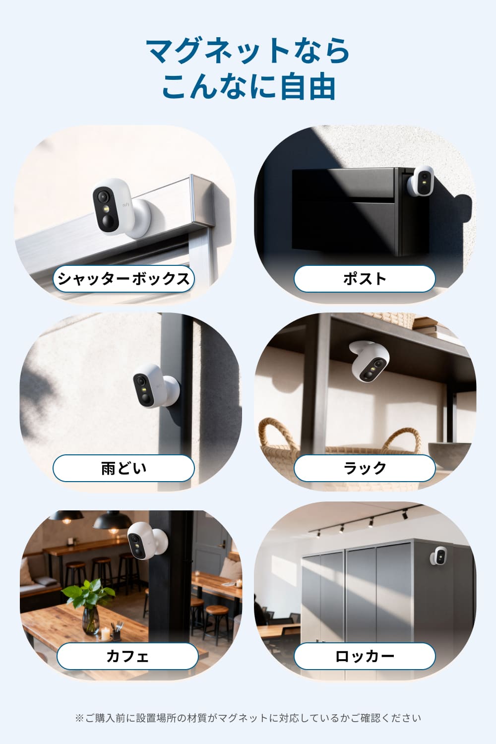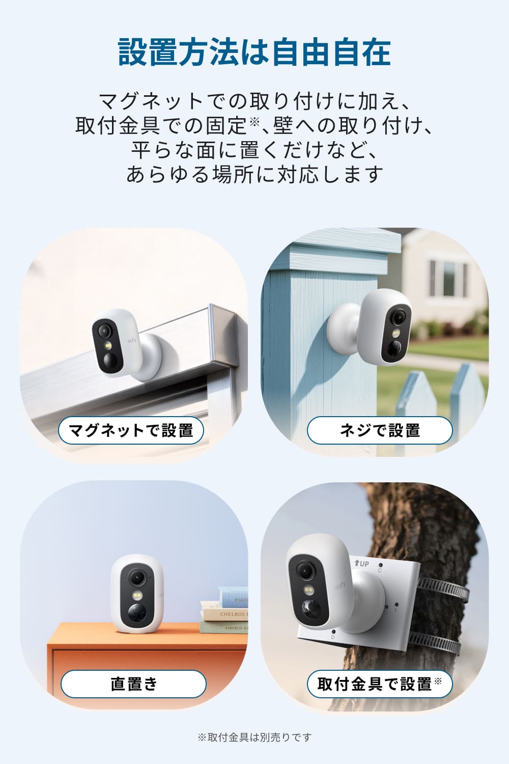 マグネットなら屋外・屋内問わずどんな場所でも簡単に設置でき、手軽に防犯対策ができます。取付金具での固定※、壁への取り付け、直置きなど様々な設置方法があります。 ※取付金具は別売りです
