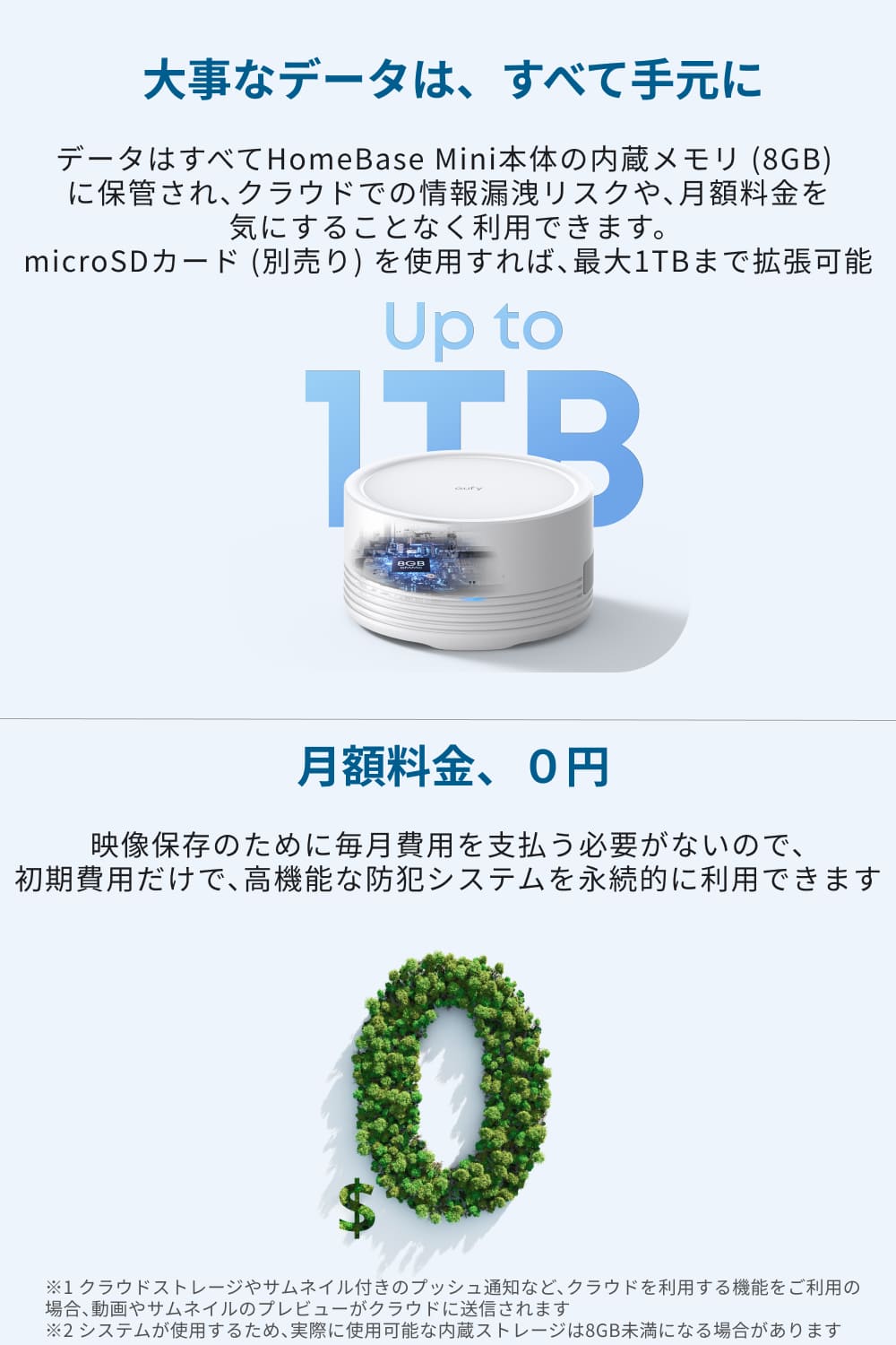 データはすべてHomeBase Mini本体の内蔵メモリ (8GB) に保管され、クラウドでの情報漏洩リスクや、月額料金を気にすることなく利用できます。microSDカード (別売り) を使用すれば、最大1TBまで拡張可能。