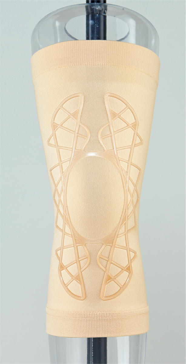 医療の現場で用いられている人体を再硯したシリコーン(タフシロン(R))を筋肉に沿って加工した膝サポーター。メッシュ形状で360度膝を包み込み、着けるだけで膝安定!膝楽らく! 適応サイズ:膝頭周囲33〜42cm